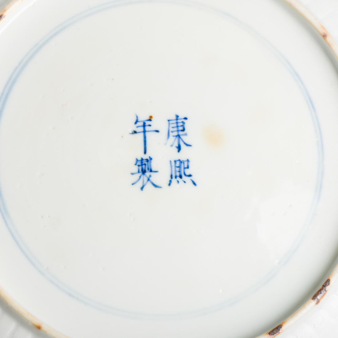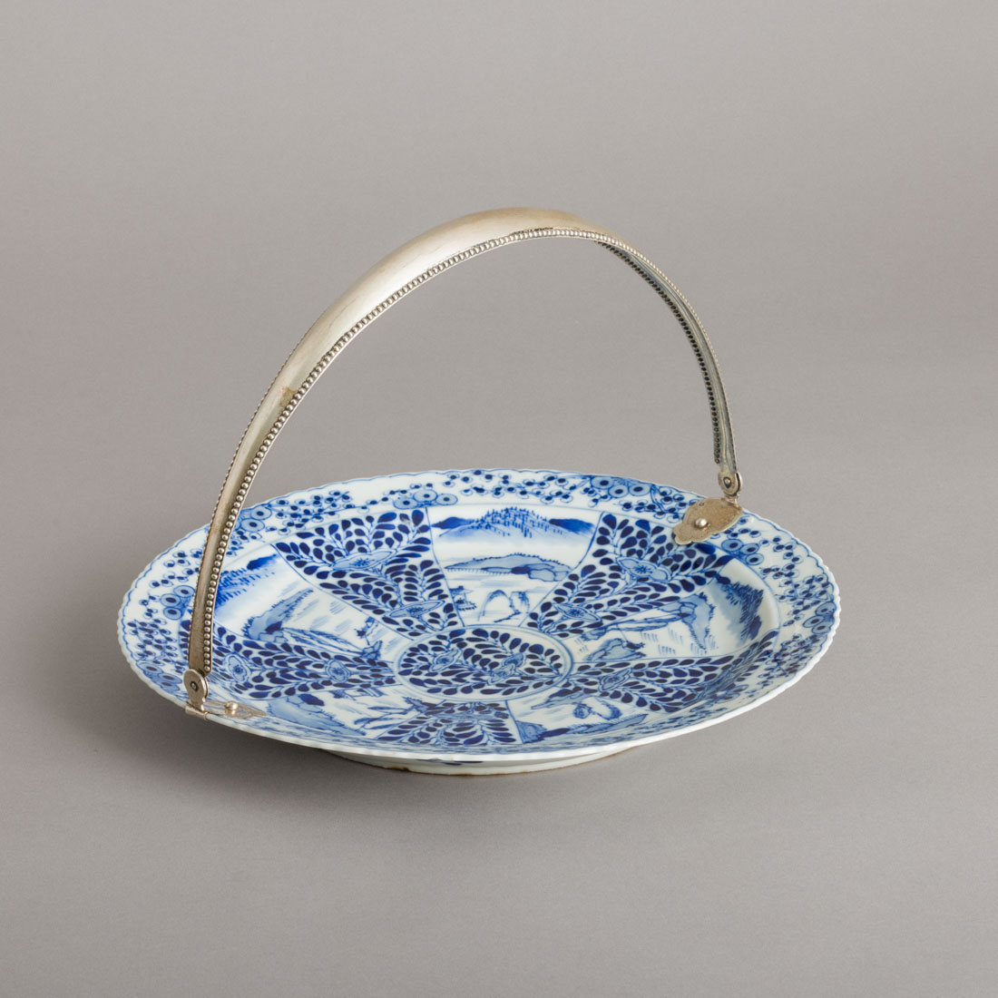 Em porcelana da China, decoração a azul "elementos vegetalistas e paisagens", asa em prata holandesa de 833, marcas de garantia e de ourives 'JM Van Kempen & Sons' (1814-1877), decoração friso de perlados. Marcada. Sinais de uso e pequenas esbeiçadelas. Dim.: 28,5 cm.
