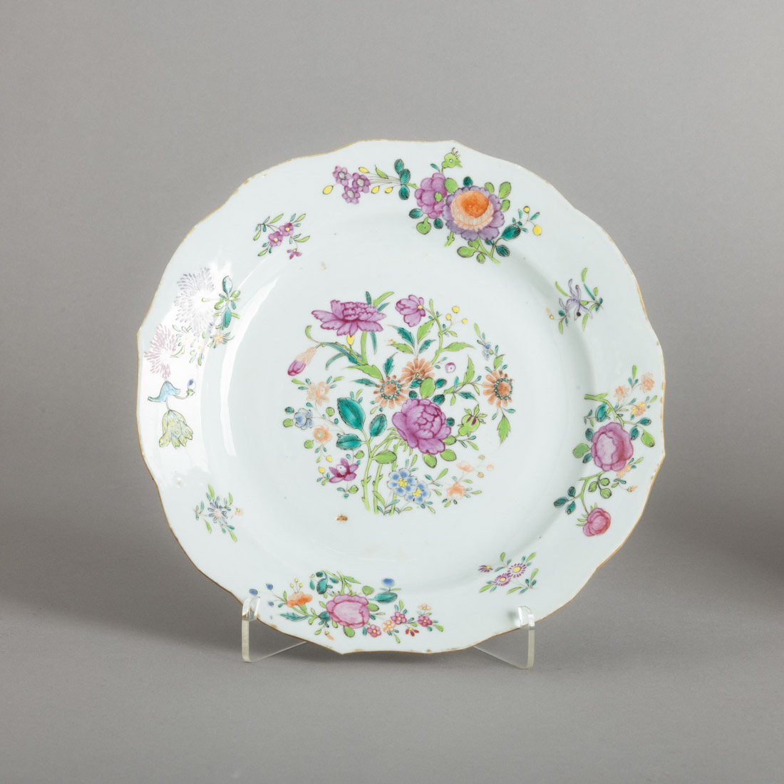 Em porcelana da China, Companhia das Índias, Séc. XVIII, decoração policromada e dourada com esmaltes da família rosa "flores". Desgaste e ínfimas esbeiçadelas.