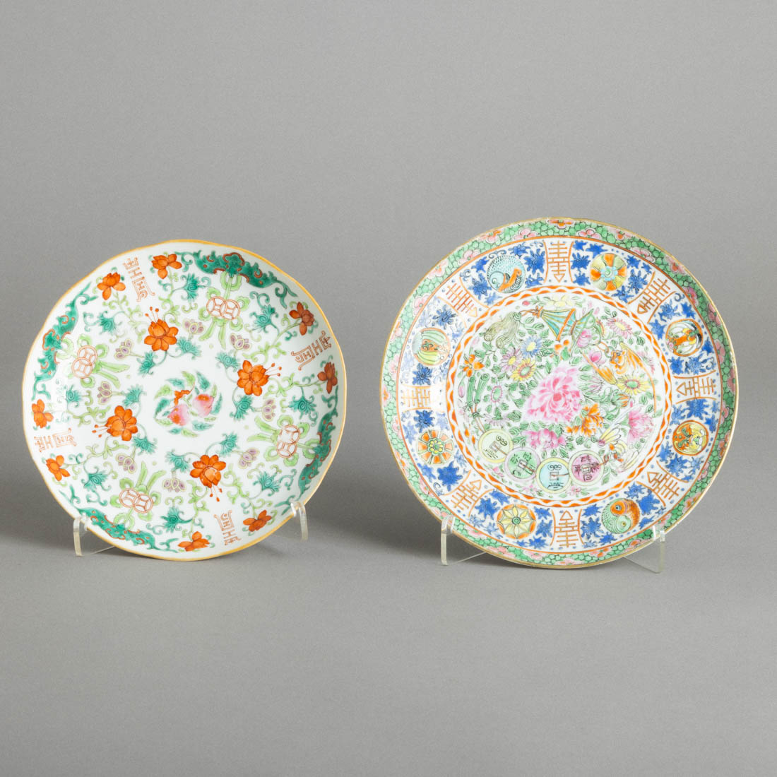 Em porcelana da China, decoração com esmaltes policromados e dourados "flores e símbolos". Sinais de uso, prato restaurado e pequenas esbeiçadelas.