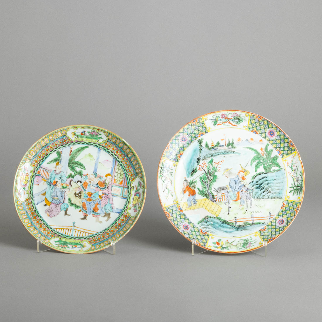 Em porcelana da China, decoração com esmaltes policromados e dourados "cena do quotidiano", na aba flores e motivos geométricos. Sinais de uso e esbeiçadelas.