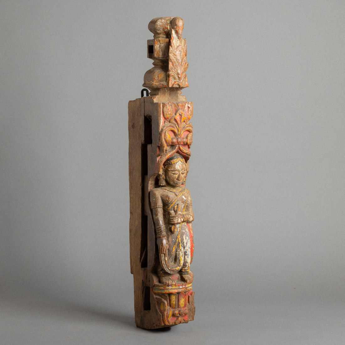 Esculpida em teca policromada, representando figura feminina e motivos vegetalistas. Rajastão, Índia. Séc. XVIII/XIX. Sinais de uso e defeitos.