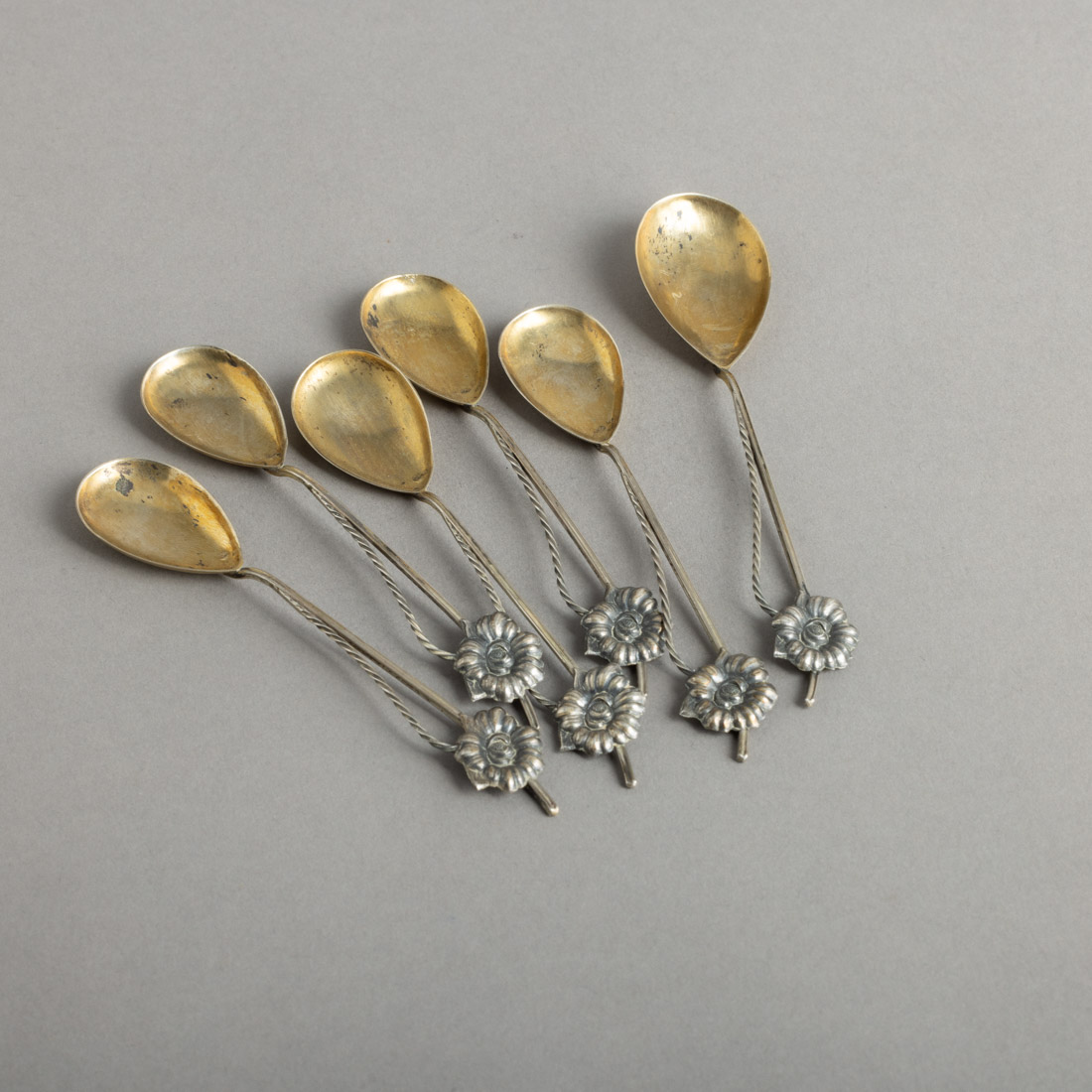 Em prata portuguesa contraste javali (1887-1937) de 833, decoração relevada "flor", parcialmente dourada. Sinais de uso e picos de oxidação.