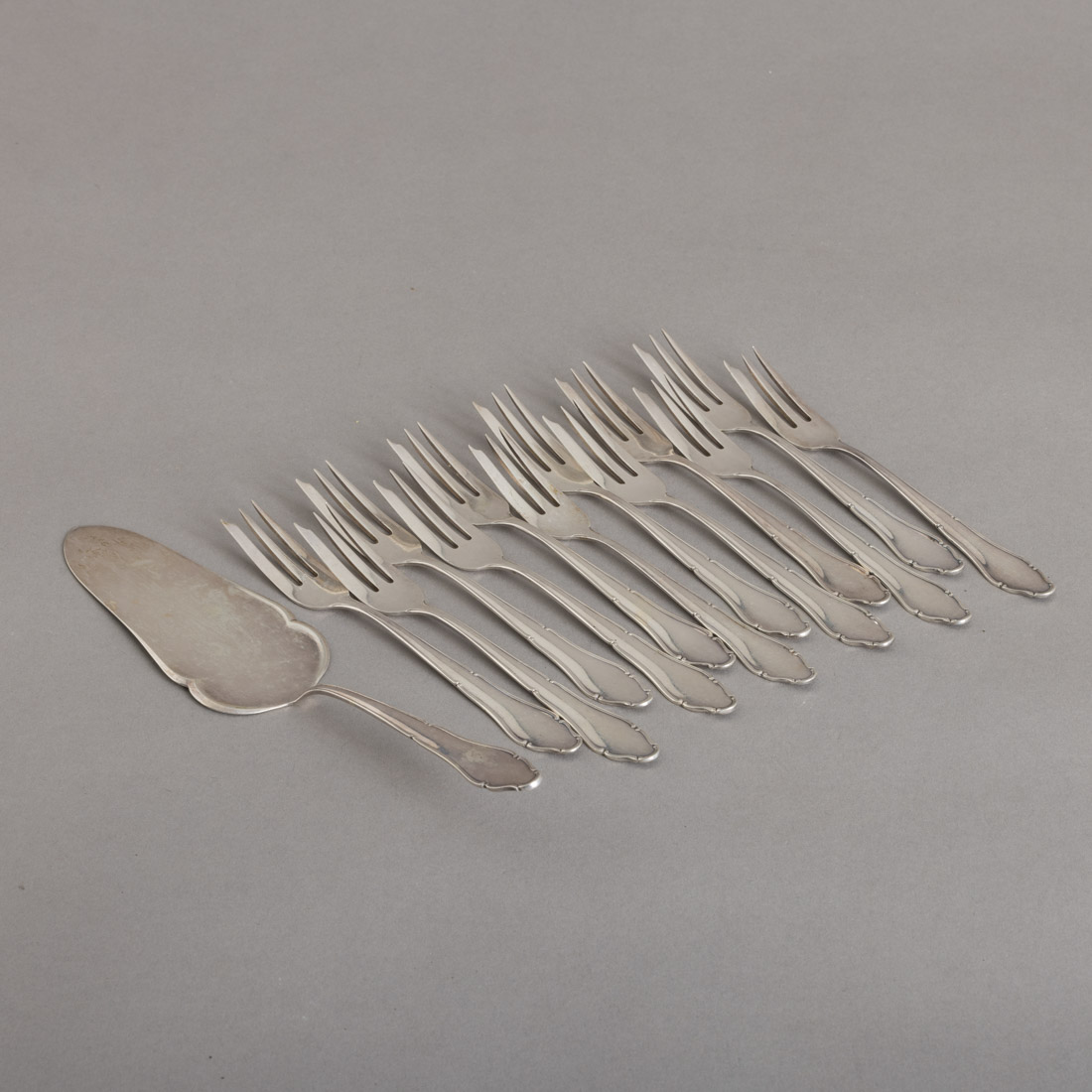 698. CONJUNTO DE DOZE GARFOS DE BOLO E ESPÁTULA