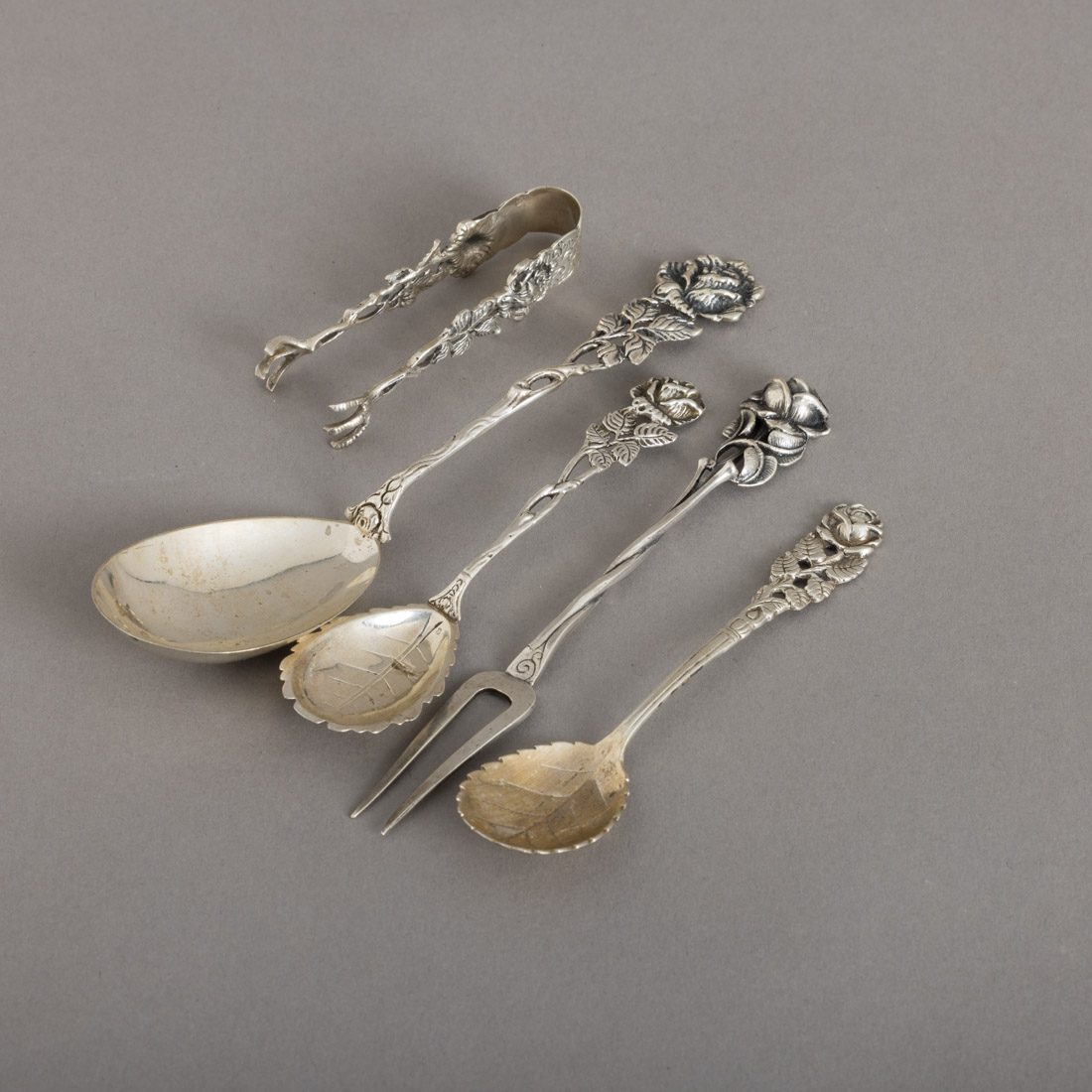 Em prata alemã de 800, marcas de garantia de teor (pós 1886), outras de 835, decoração relevada e vazada "rosas". Sem marcas portuguesas, ao abrigo do Decreto-Lei n.º 120/2017. Sinais de uso e pequenos defeitos. Peso aprox.: 75 g. Dim.: 7,5 a 16 cm.