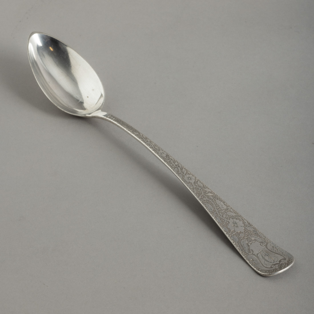 Em prata portuguesa contraste javali (1887-1937) de 833, marca de ourives (P-98) António Alves de Sousa, decoração relevada "flores", monogramada. Sinais de uso.