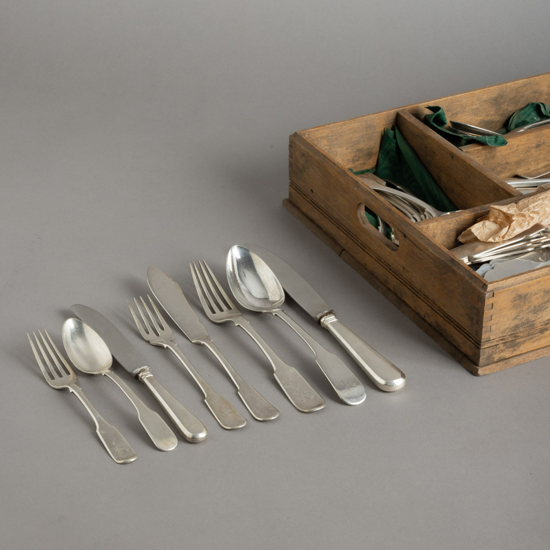 Em prata portuguesa do Séc. XIX/XX de 833, de diferentes marcas de ourives e prateiros, decoração lisa e parte monogramada. Composto por talheres de carne, de peixe, de sobremesa, colheres de sopa e de sobremesa. Sinais de uso e pequenas amolgadelas. Pesototal aprox.: 5391 g.