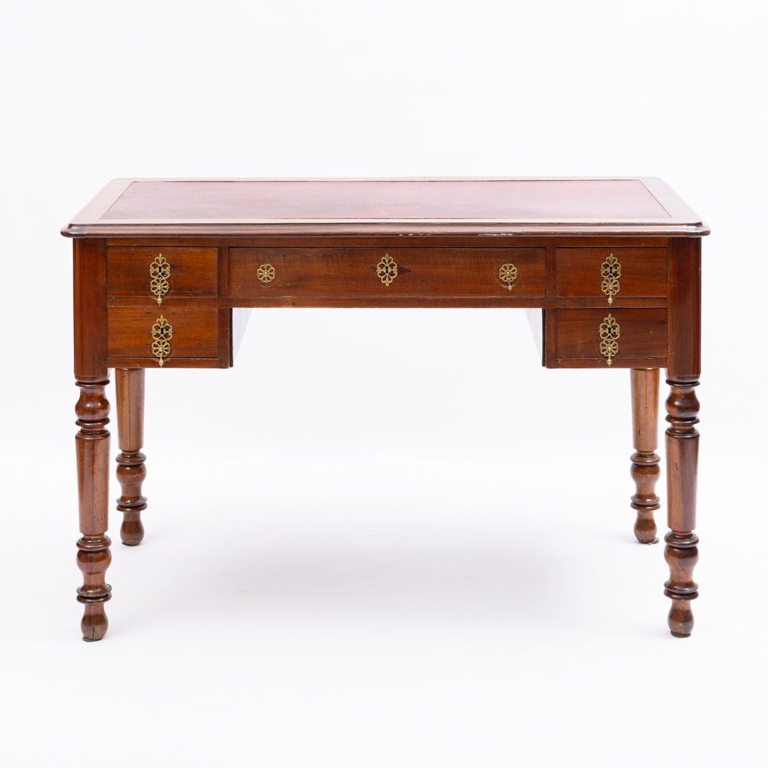 Em diferentes madeiras, pernas torneadas, de cinco gavetas, puxadores em metal amarelo. Pequenas falhas, defeitos e vestígios de xilófagos.