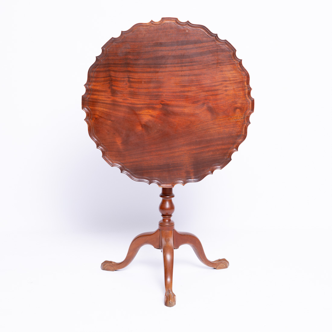 Estilo D. José, em madeira de tampo recortado basculante, coluna central torneada e pés entalhados. Sinais de uso, pequenas falhas, pequenos defeitos e falta cunha.