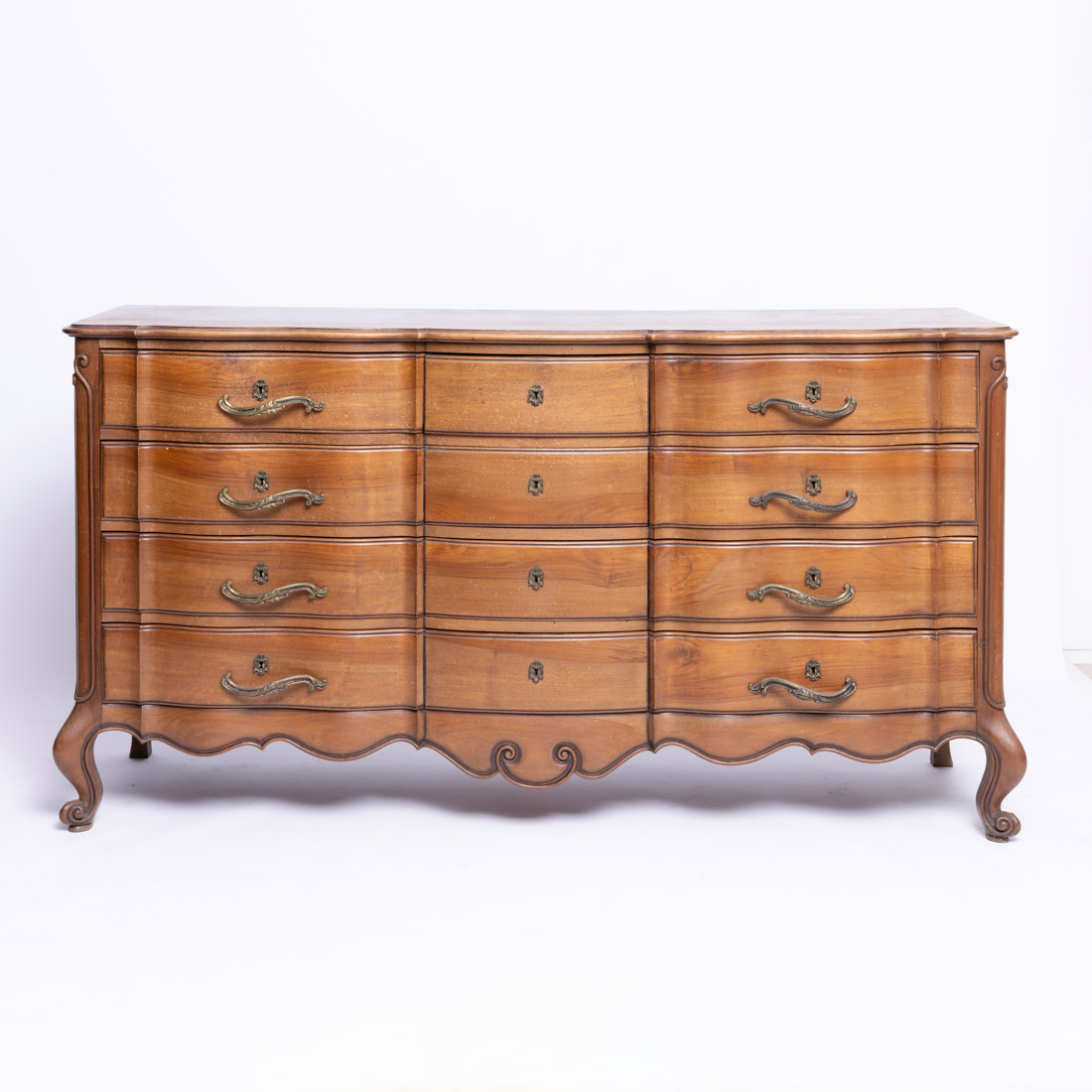 Em madeira exótica com entalhamentos, saiais e pés com entalhamentos, tampo recortado, de doze gavetas, puxadores em metal amarelo. Sinais de uso e pequenos defeitos.