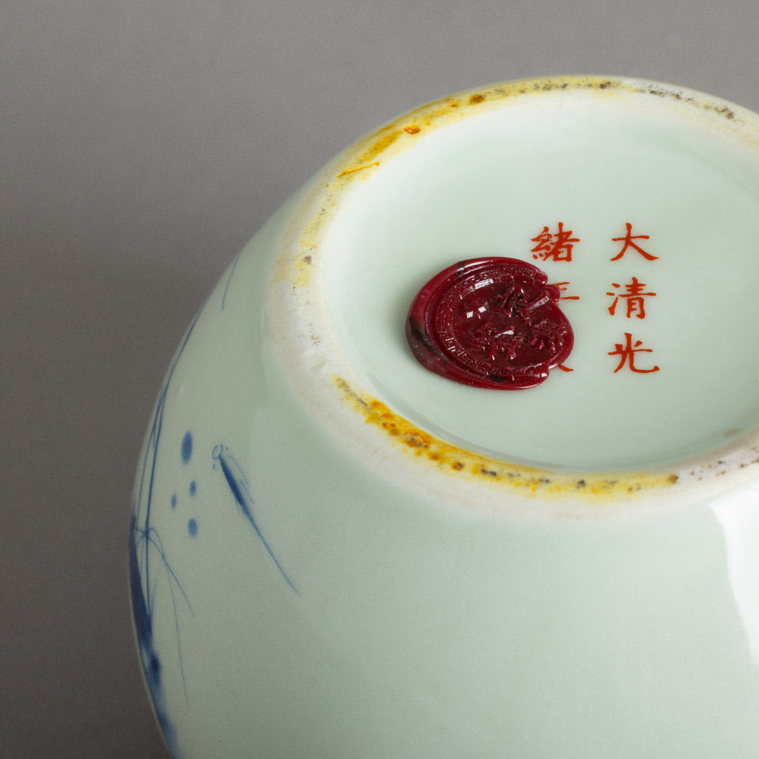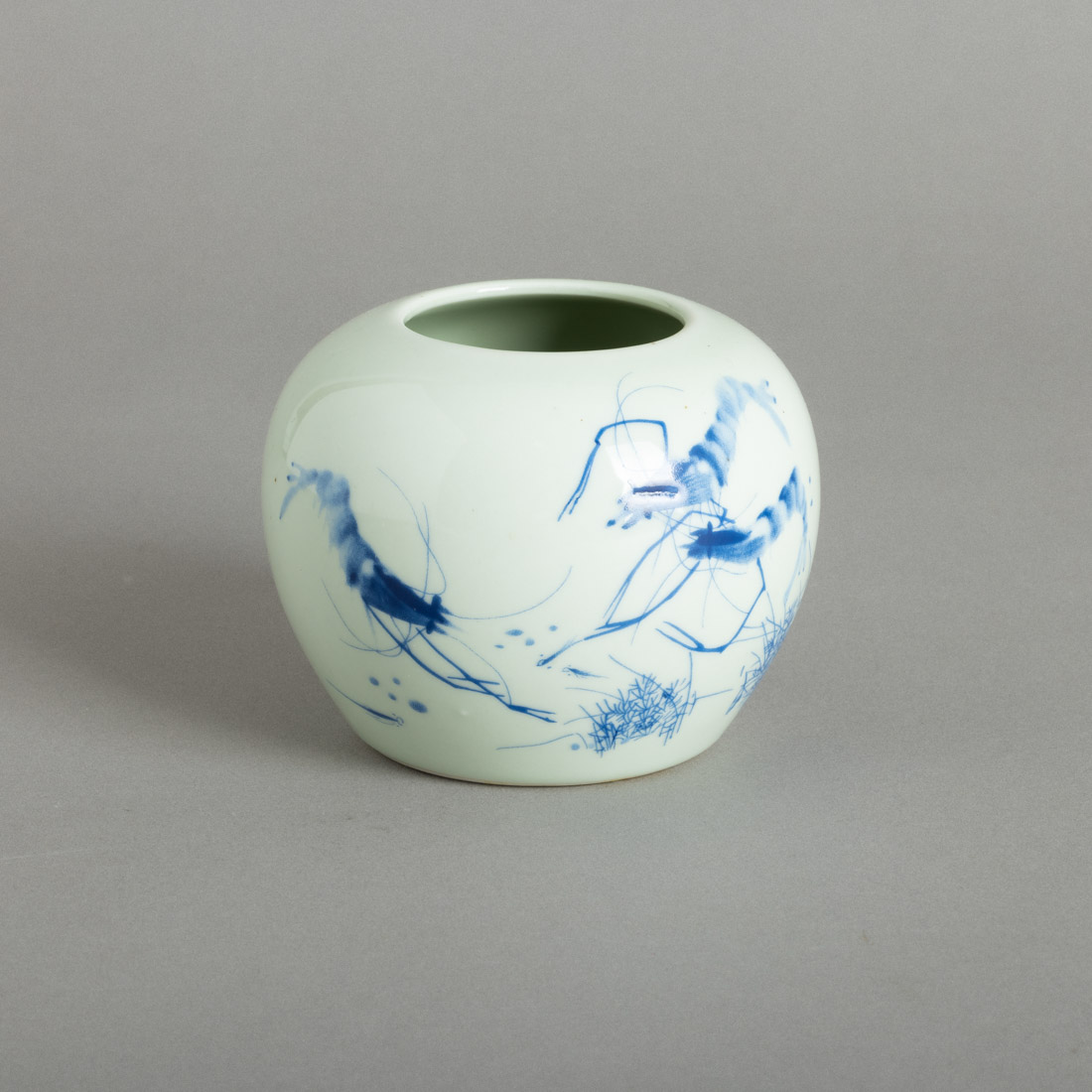 Em porcelana da China, decoração a azul "camarões e caligrafia". Marcada. Sinais de uso.