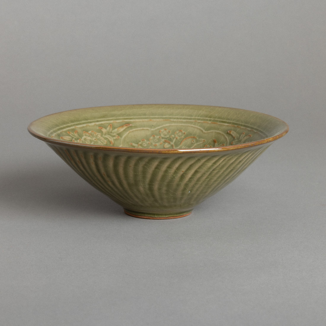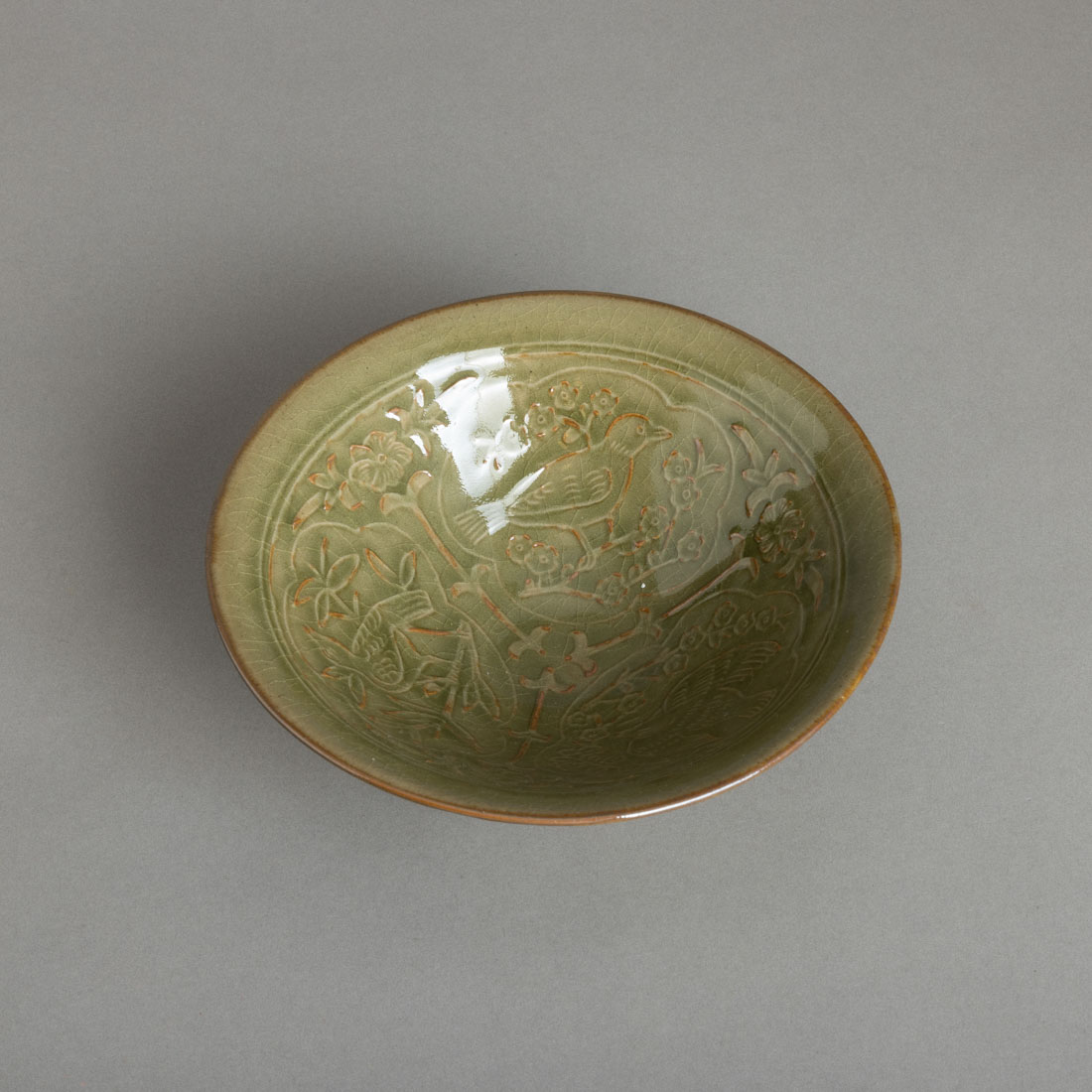 Em cerâmica chinesa "Celadon", decoração relevada e gravada "pássaros e flores". Sinais de uso, craquelê.