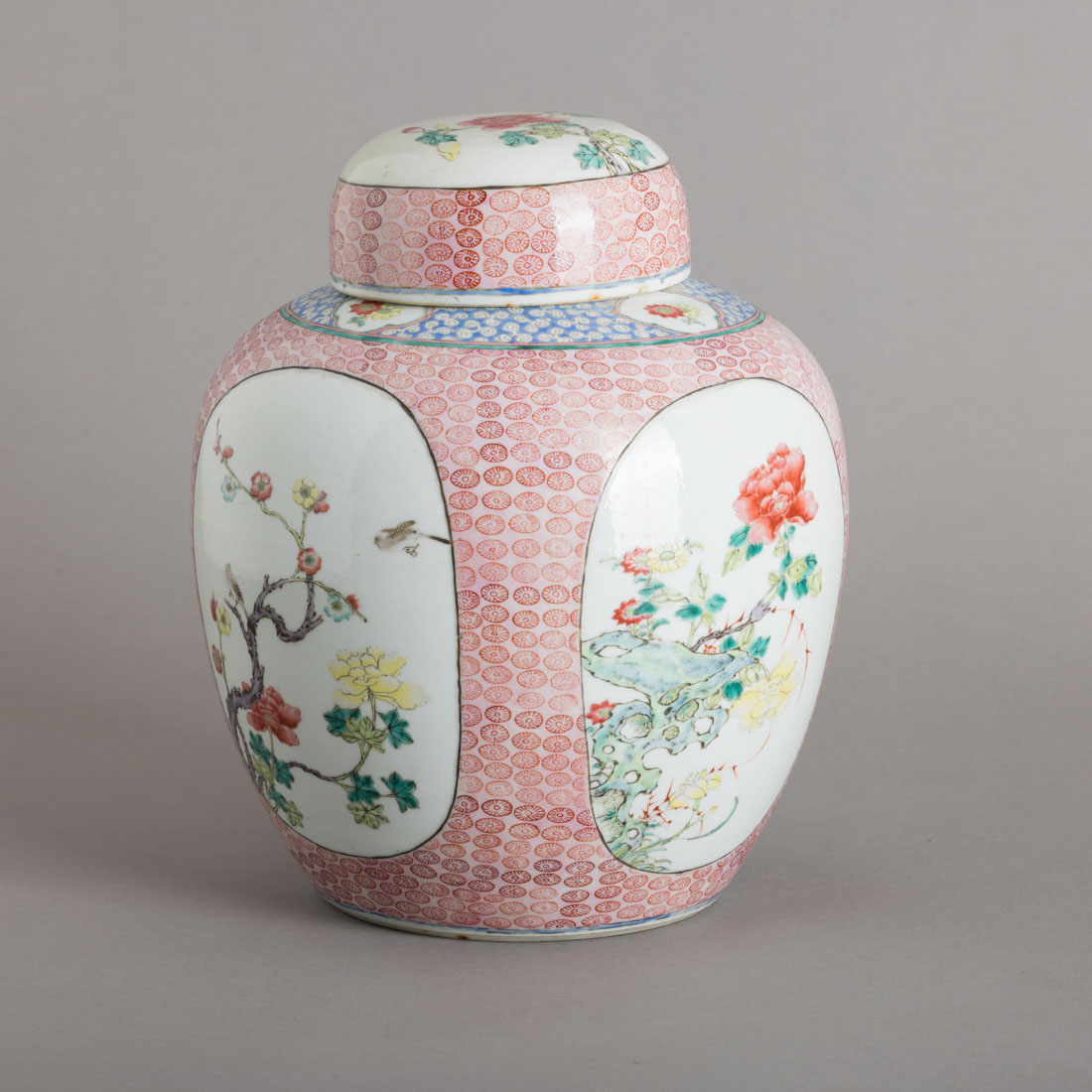 Em porcelana da China, decoração policromada com reservas da família rosa "flores e pássaros", marcada. Sinais de uso, esbeiçadelas na boca e tampa com cabelo.