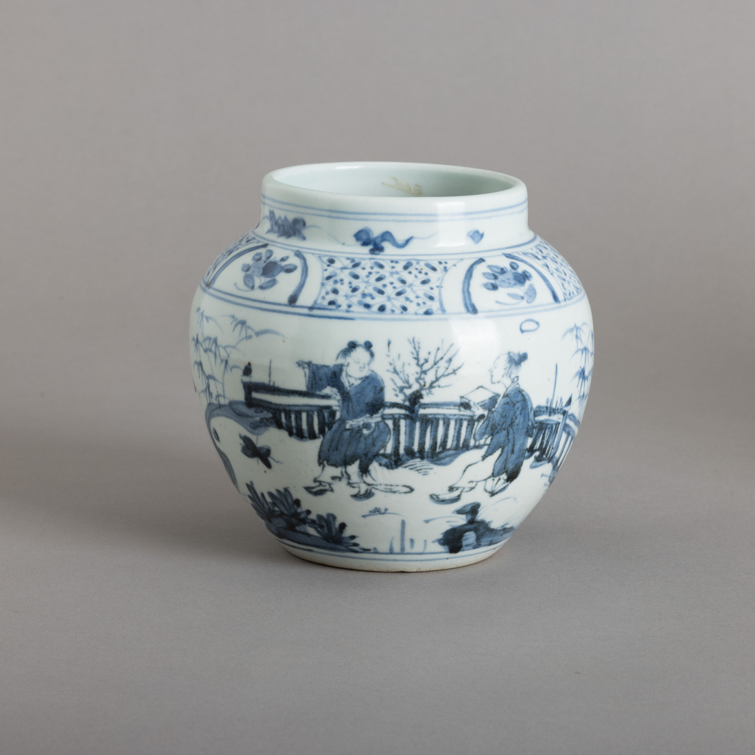 Em porcelana da China, decoração a azul "paisagem com figuras", friso superior com elementos vegetalistas. Sinais de uso.