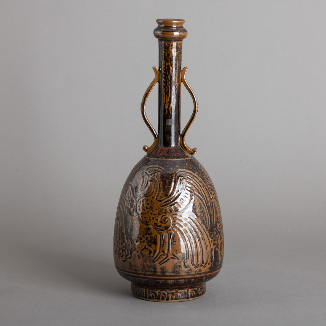 Em cerâmica vidrada decoração gravada a castanho "pássaros". China. Sinais de uso e gargalo com restauro.