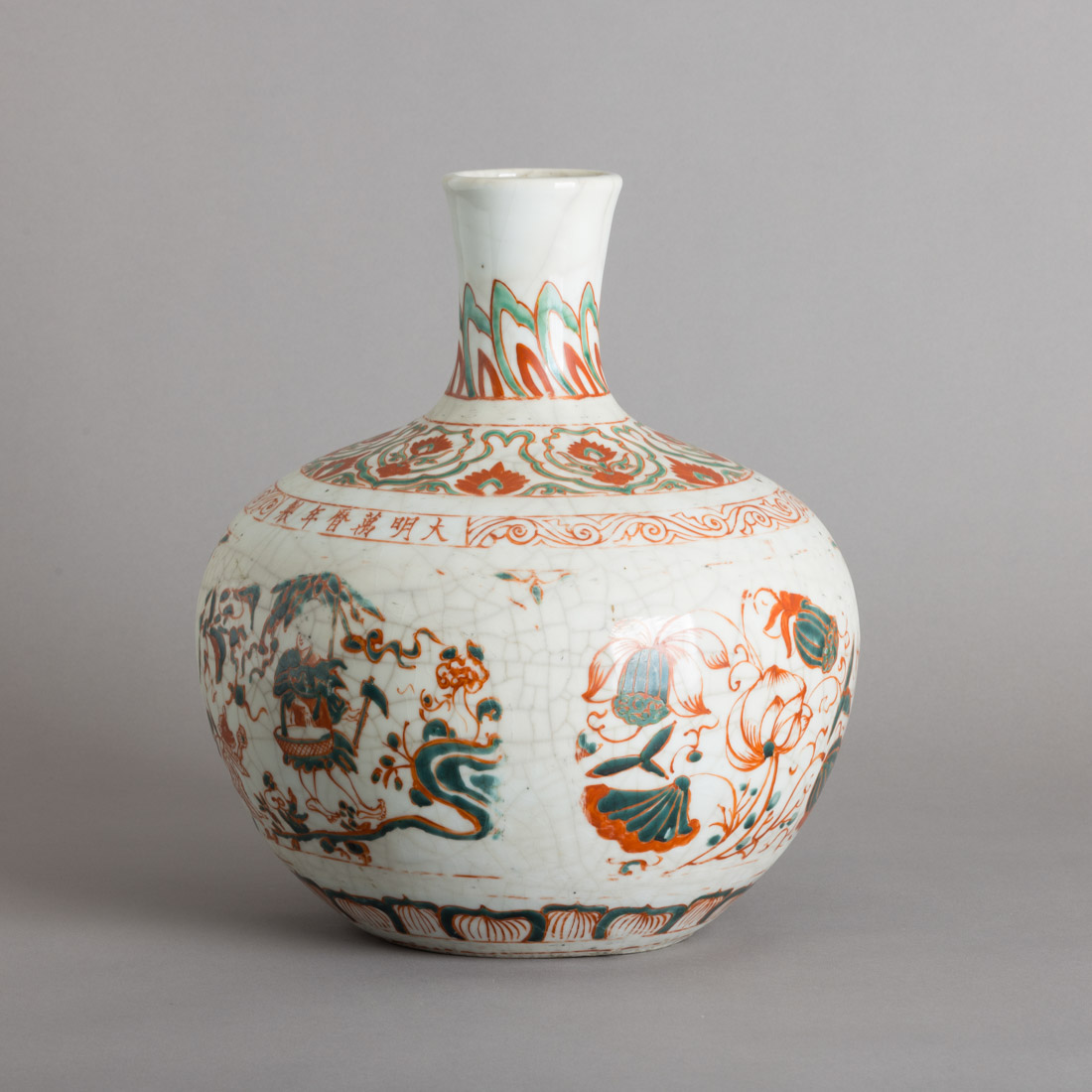 Em porcelana da China, decoração com esmaltes da família verde e rouge de fer "paisagem com figuras e flores de lótus". Sinais de uso, craquelê e desgaste.