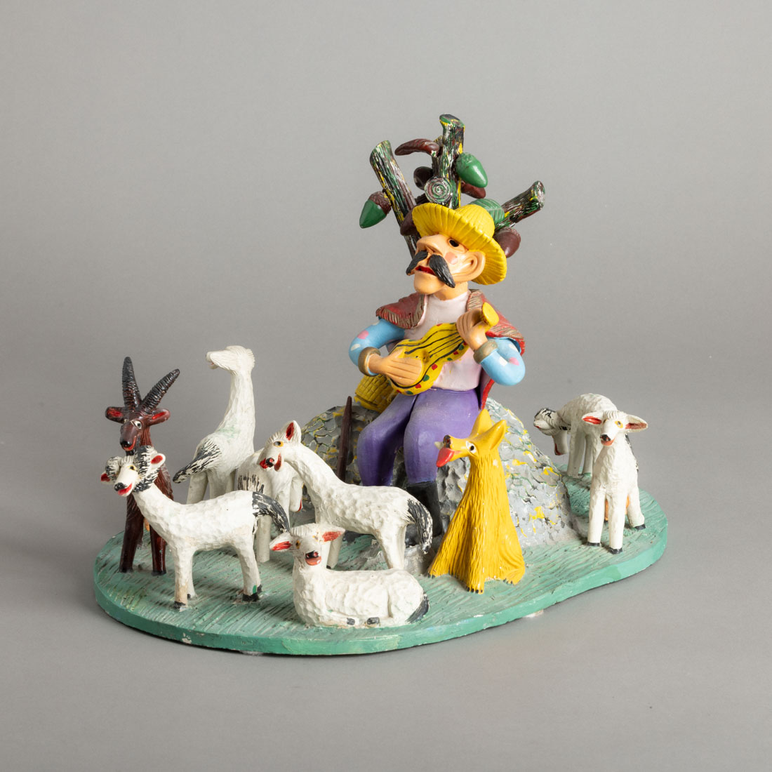 Grupo escultórico em barro, decoração policromada, representando pastor a tocar viola com o seu rebanho. Assinado. Pequenas falhas, árvore com um ramo colado.