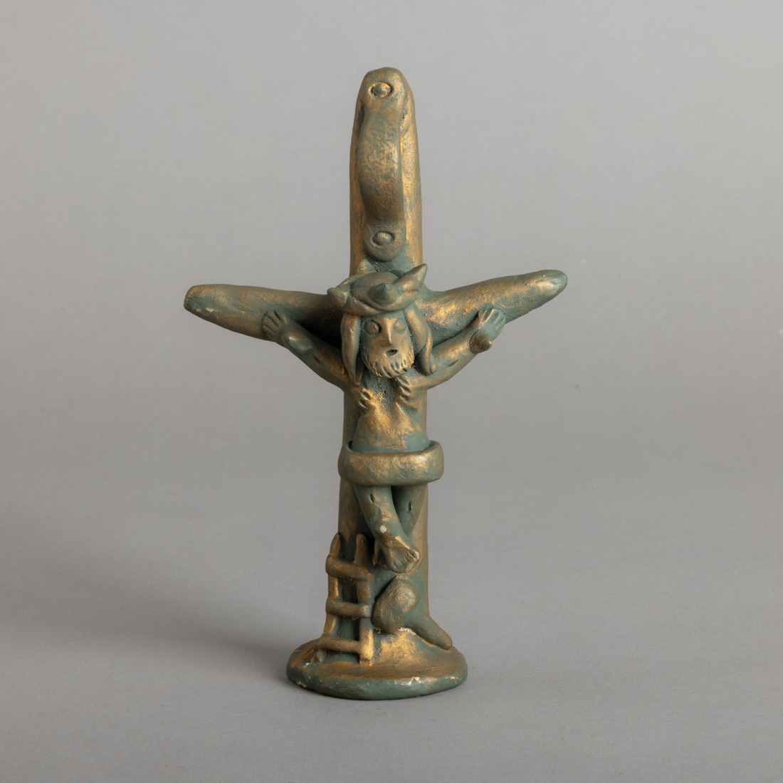Escultura em barro, decoração monocroma, posteriormente dourada. Assinada. Sinais de uso.