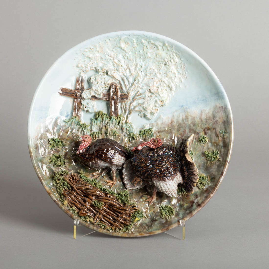 Em cerâmica vidrada das Caldas, decoração relevada e policromada, marcada Fábrica de Faianças das Caldas da Rainha - Rafael Bordalo Pinheiro e datada de 1907. Pequenas falhas, faltas no bico, pata e nas penas da cauda.