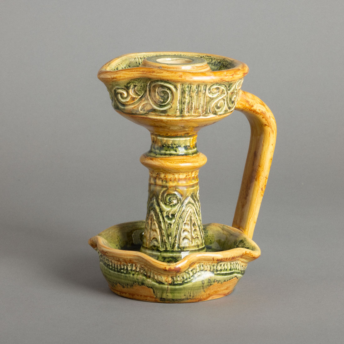 Em cerâmica vidrada fabrico Aleluia, Aveiro, decoração relevada e policromada com elementos geométricos, marcada. Sinais de uso.