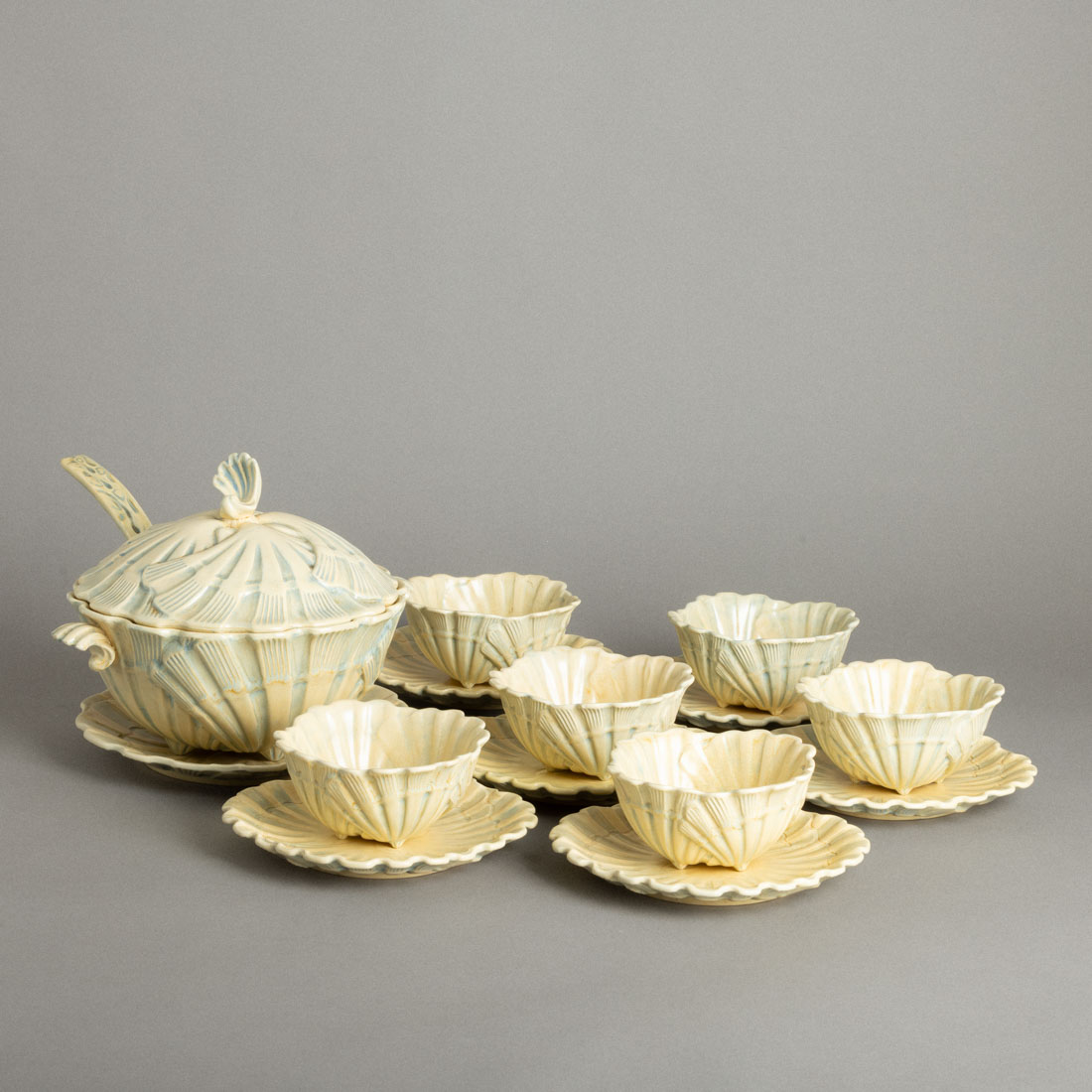 Em cerâmica vidrada fabrico Aleluia, Aveiro, decoração relevada em tons de ocre, Séc. XX (anos 60), marcada. Sinais de uso, concha e duas taças com esbeiçadelas.