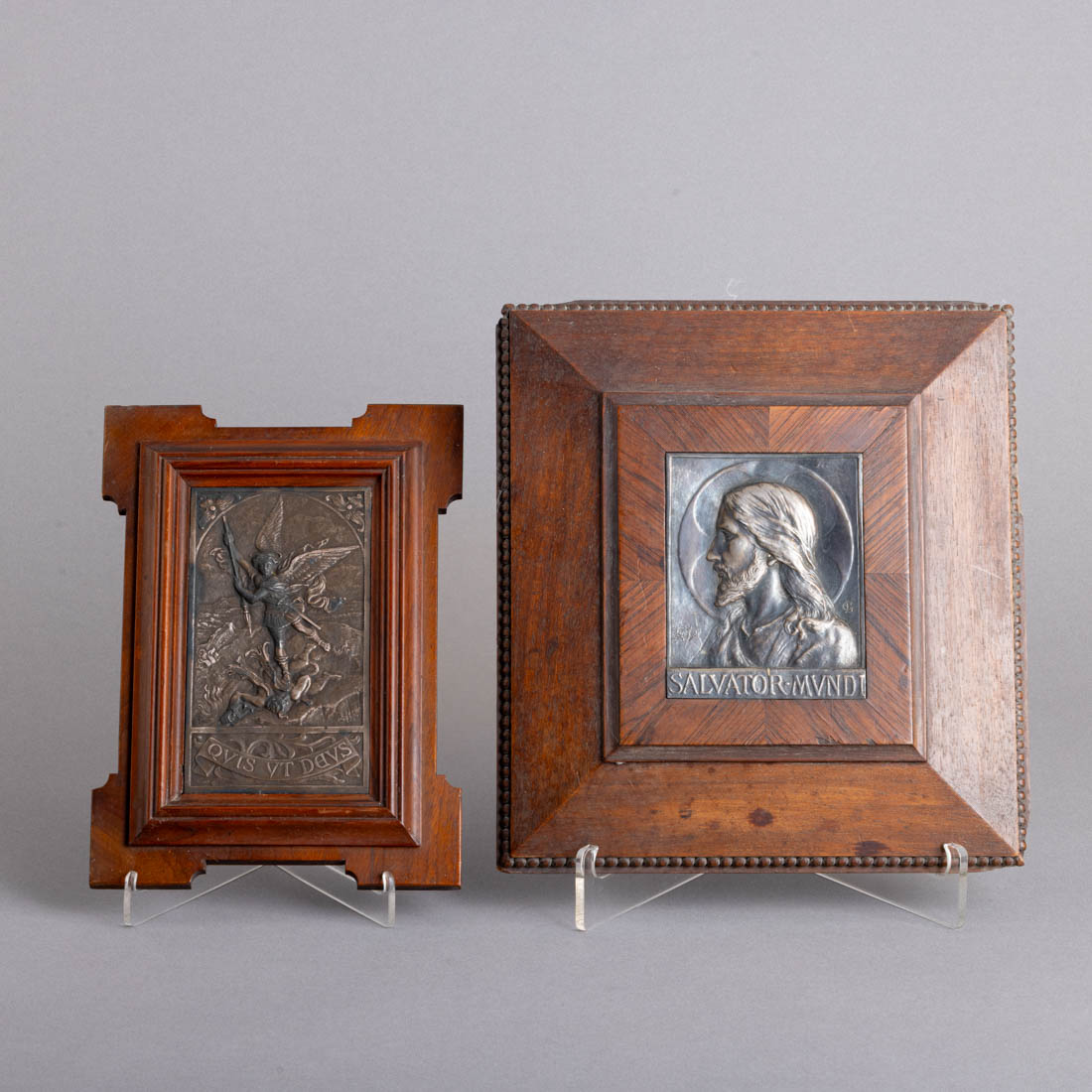 Duas placas, uma em metal prateado e outra em prata, decoração relevada, molduras em madeira. Sem marcas, ao abrigo do Decreto-Lei n.º 120/2017. Pequenas falhas e defeitos nas molduras.