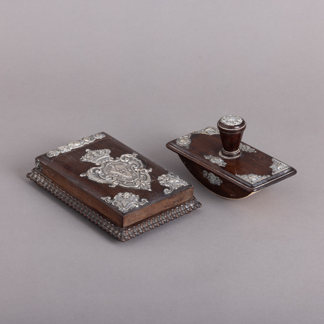 Em pau santo com aplicações em prata portuguesa javali (1887-1937) de 833, decoração relevada "flores e armas portuguesas" e tremidos. Mata-borrão sem marcas, ao abrigo do Decreto-Lei n.º 120/2017. Sinais de uso, pequenos defeitos e algumas falhas. Dim.:8,5x15x7,5 a 18,5x12 cm.