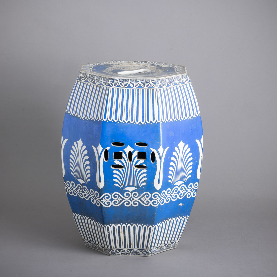 Em loiça pó de pedra inglesa, marcado Copeland, decoração vazada e a azul "motivos vegetalistas e frisos geométricos". Séc. XIX. Sinais de uso, desgaste no vidrado e cabelos.