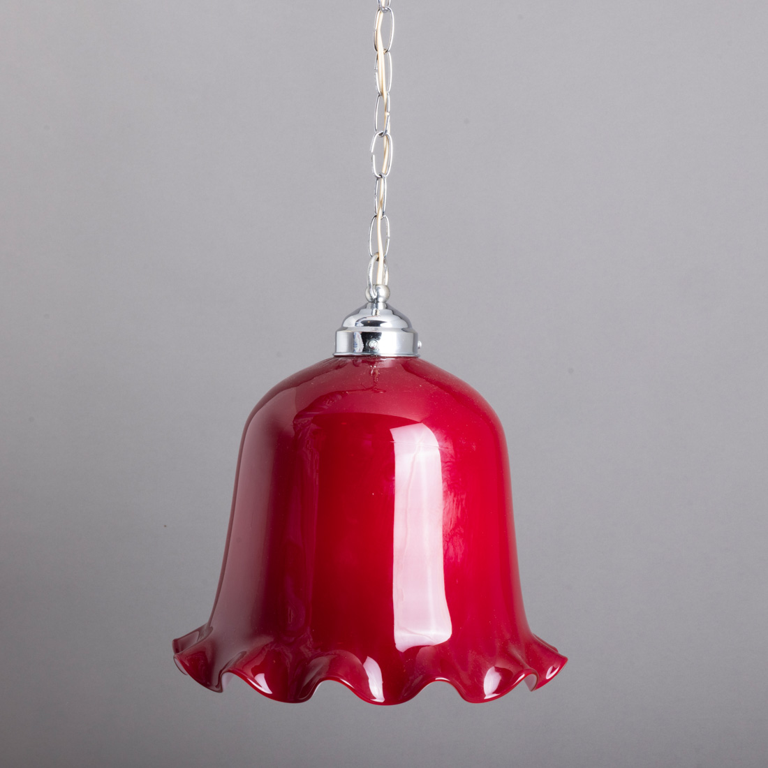 Em vidro bordeaux com interior branco, bordo ondulado e metal cromado. Sinais de uso.