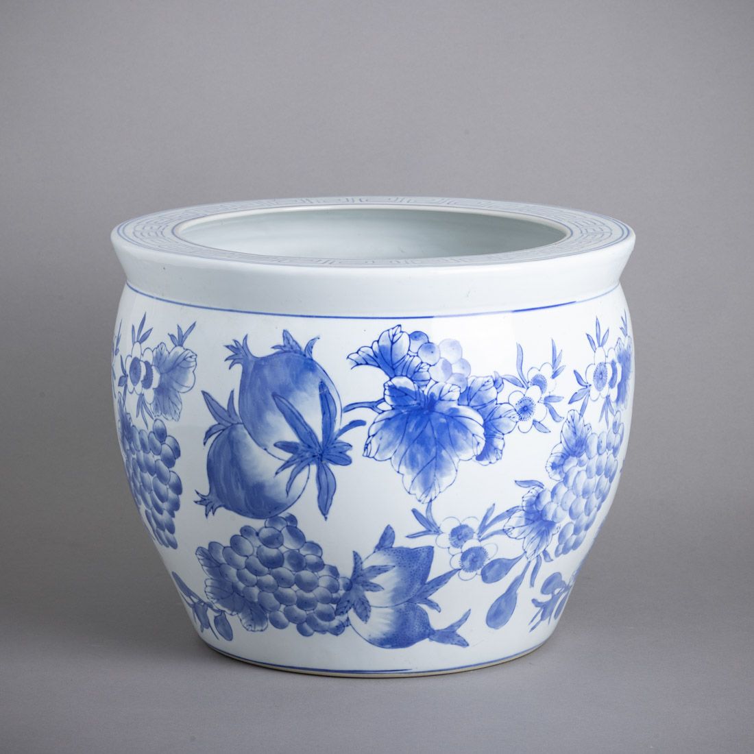 Em porcelana da China, decoração a azul "frutos e folhagem" no bordo grega. Sinais de uso.