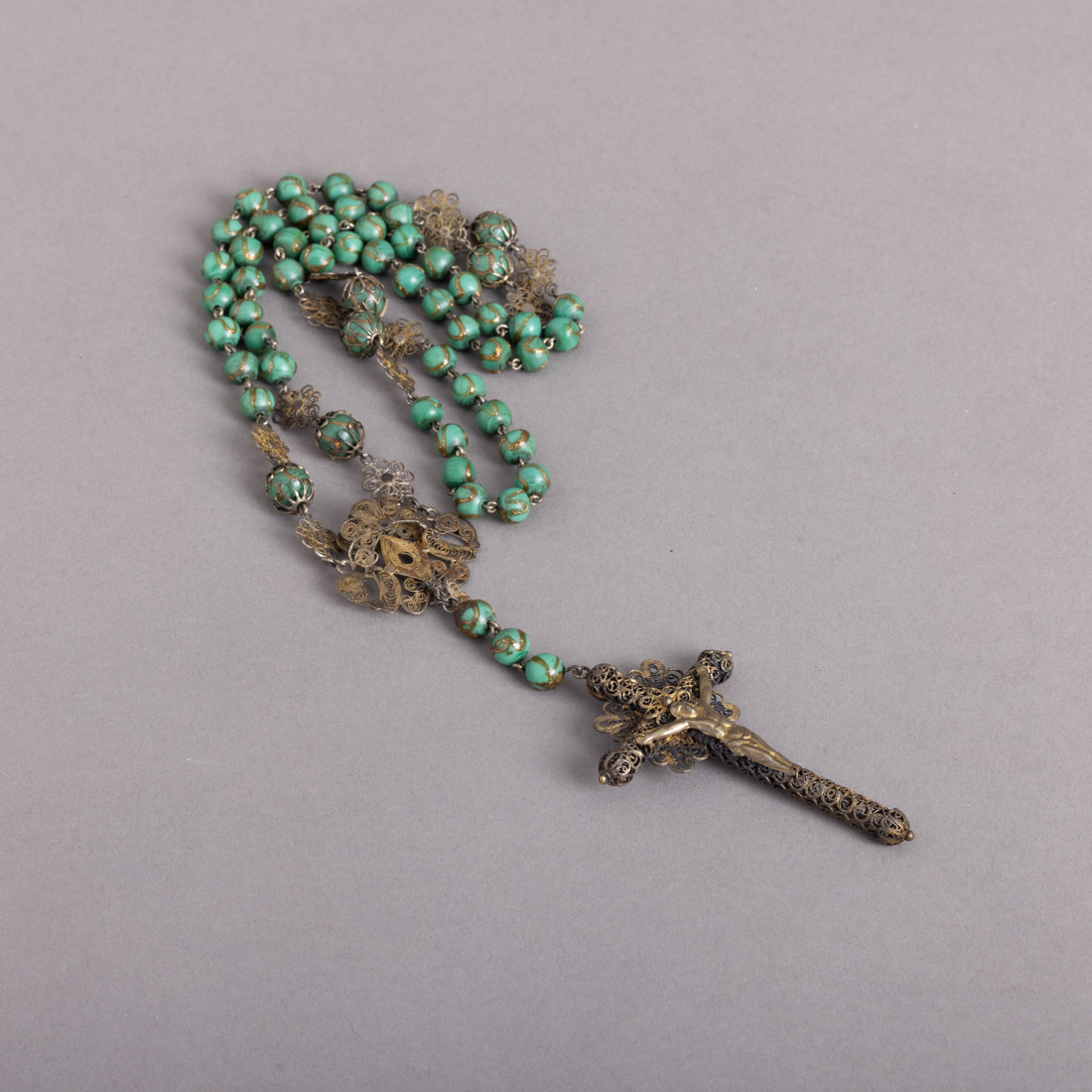 Em prata e filigrana de prata, contas em malaquite com aplicações douradas. Séc. XIX/XX. Sem marcas, ao abrigo do Decreto-Lei n.º 120/2017. Sinais de uso e pequenas falhas.