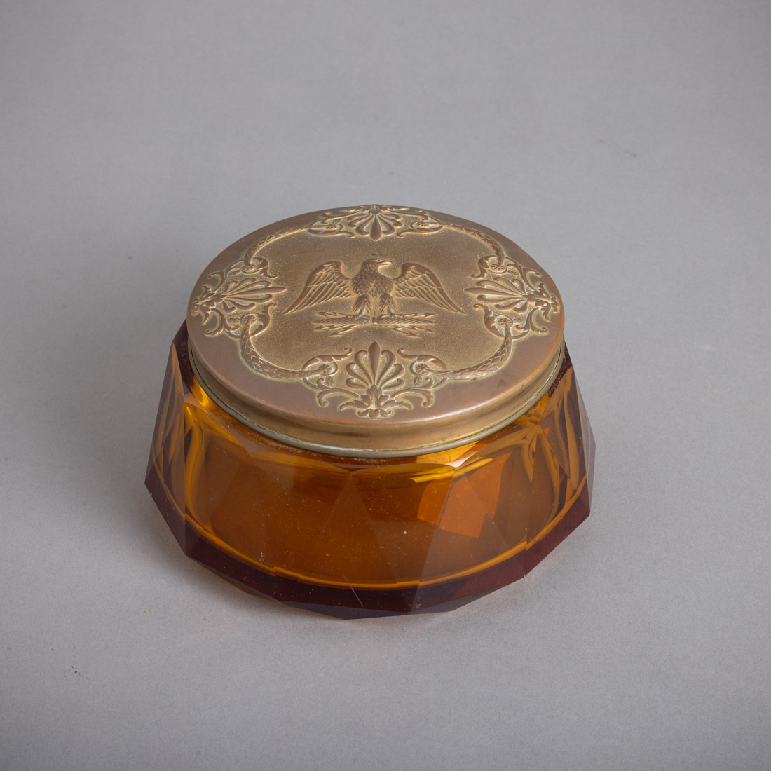 Em vidro âmbar facetado, tampa em metal dourado, decoração relevada "águia". Sinais de uso e desgaste.