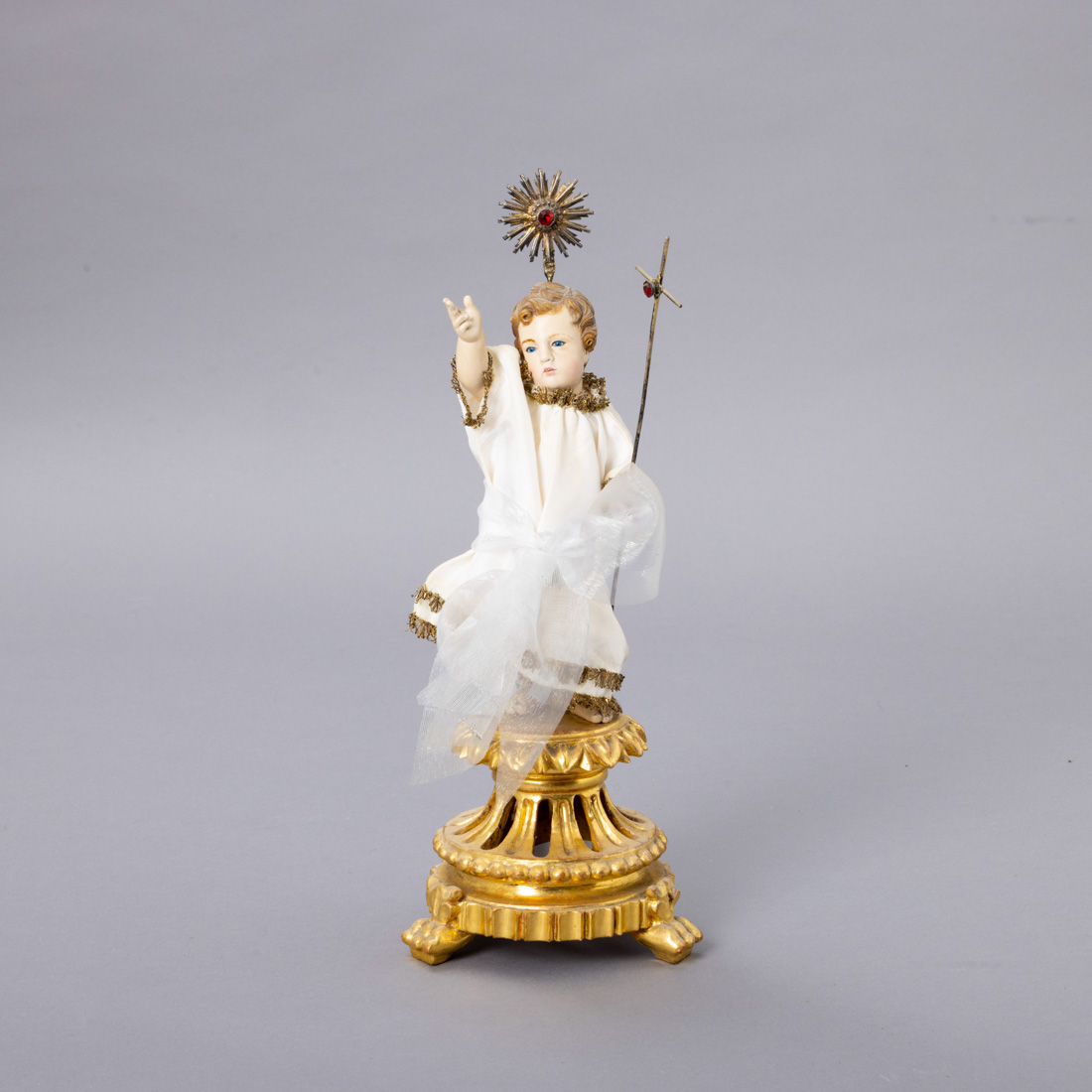 Escultura em madeira decoração policromada, olhos em vidro, vestido, atributos em prata, base em madeira entalhada e dourada. Séc. XIX. Sinais de uso.