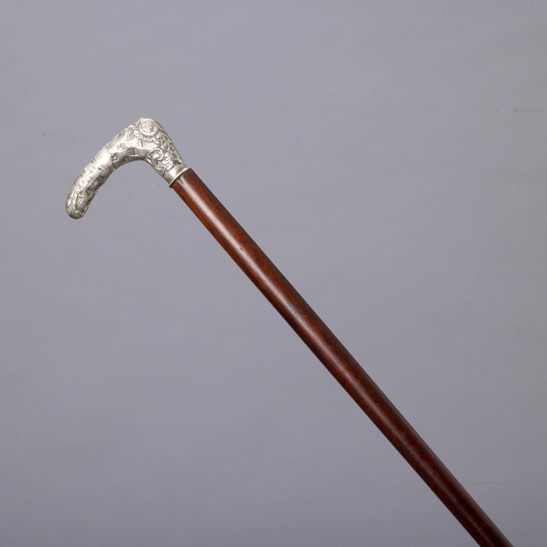 Em madeira, castão em prata portuguesa contrastes com desgaste, decoração relevada com elementos vegetalistas, ponteira também em prata. Ao abrigo do Decreto-Lei n.º 120/2017. Amolgadelas, pequenos defeitos.