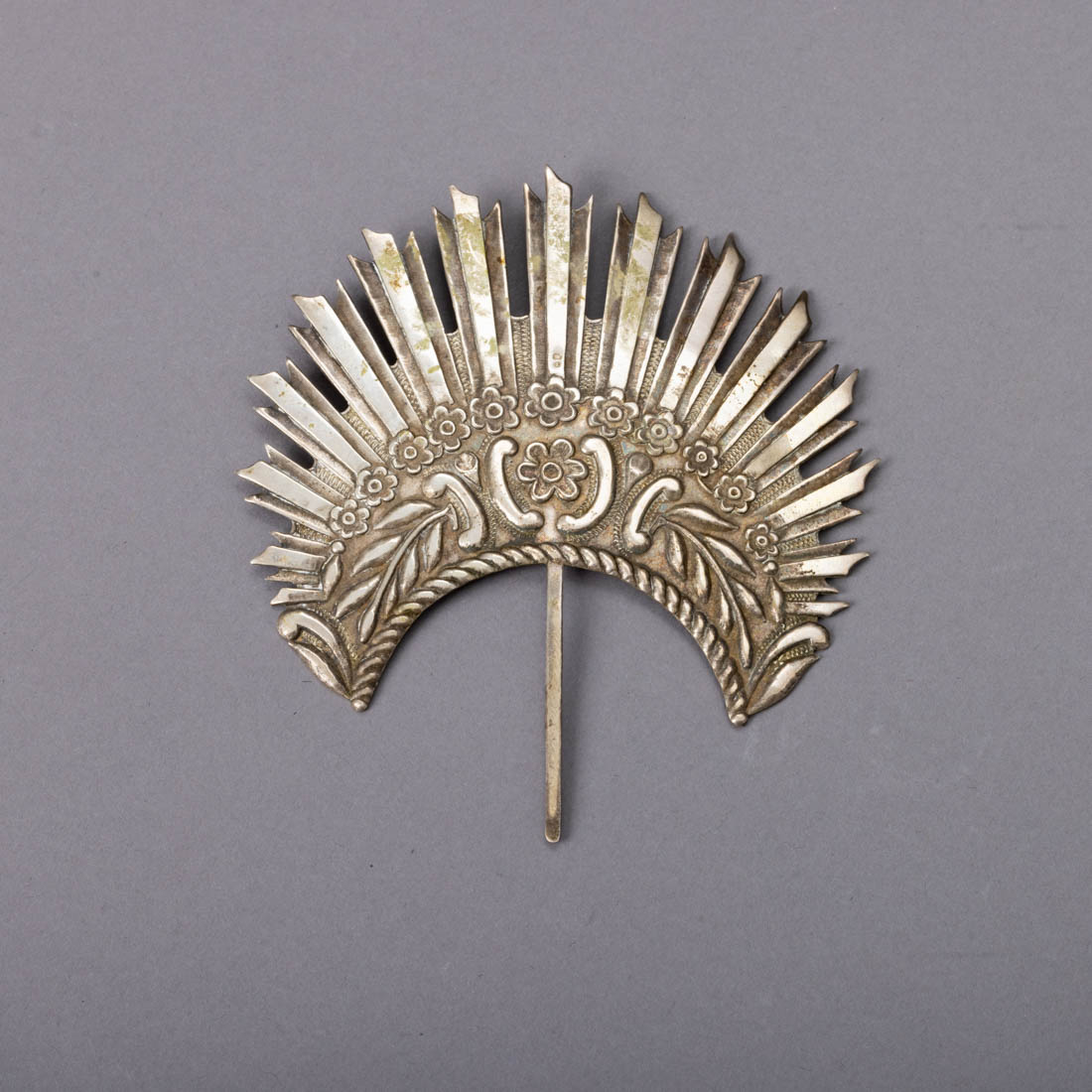 Em prata portuguesa contraste águia (pós 1985) de 925, decoração relevada e recortada "flores". Sinais de uso, leves amolgadelas.