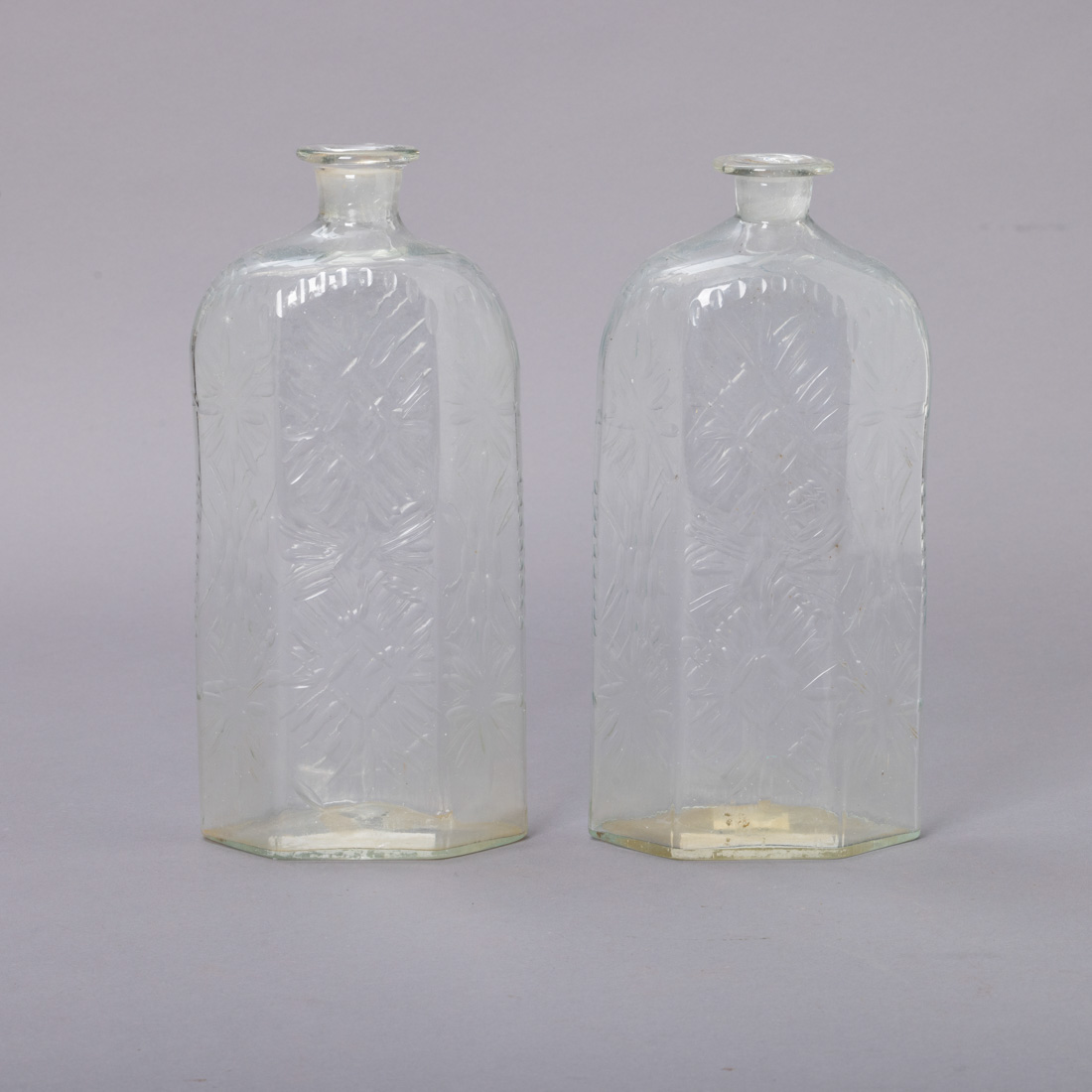 Em vidro soprado e moldado, decoração gravada. Séc. XVIII/XIX. Falta tampas. Sinais de uso.