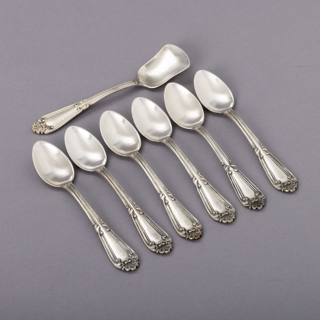 651. CONJUNTO DE SEIS COLHERES DE CHÁ E CONCHA DE AÇÚCAR