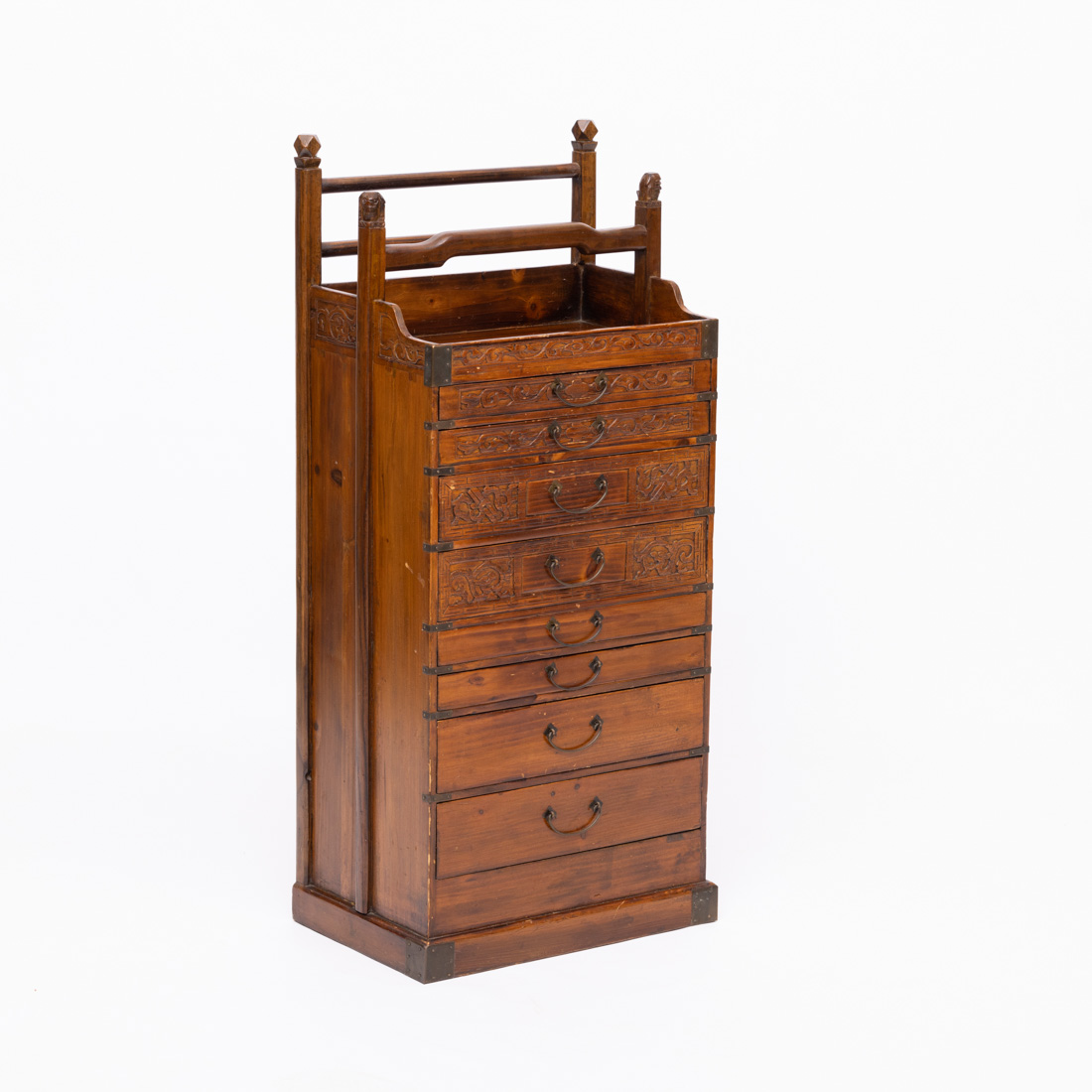 Em madeira exótica com entalhamentos, de oito gavetas. Pequenos defeitos.