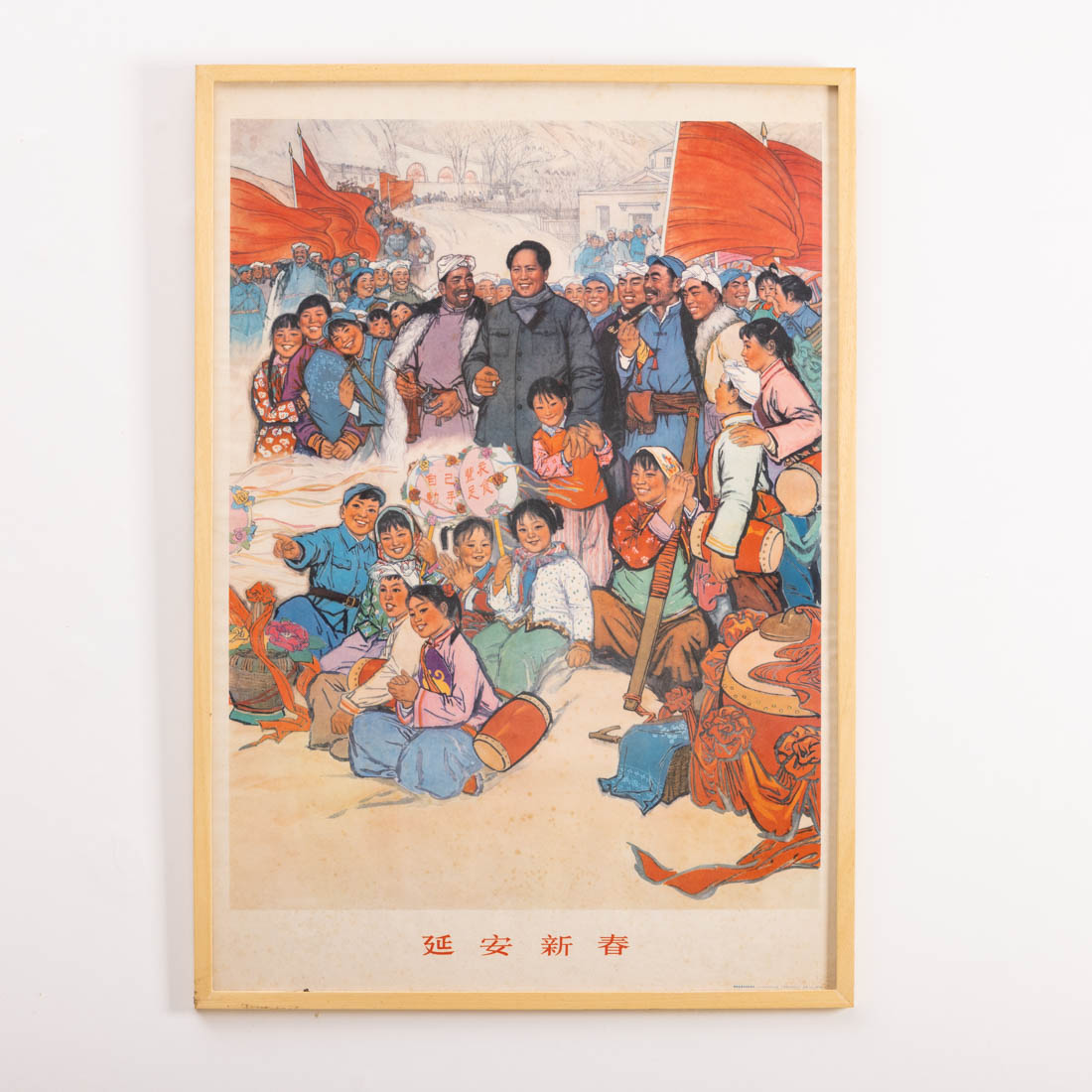 Litografia colorida sobre papel, representando Mao Tsé-Tung entre compatriotas. Sinais de humidade.