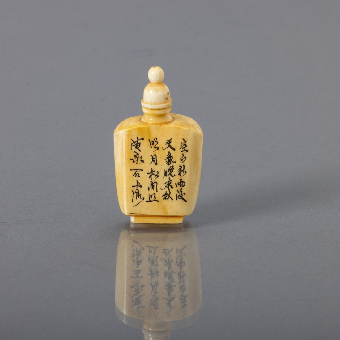 Em osso, decoração gravada com paisagem montanhosa e caracteres. China. Sinais de uso.