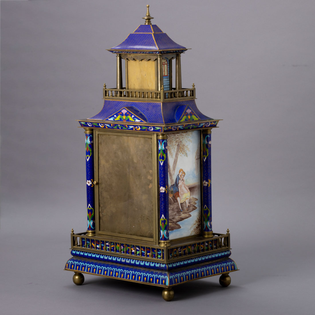 Em metal amarelo e esmaltes cloisonné "flores", mostrador e pêndulo esmaltados com paisagens fluviais e laterais esmaltados com figuras europeias. Com chave, em funcionamento. Sinais de uso e pequenos defeitos.