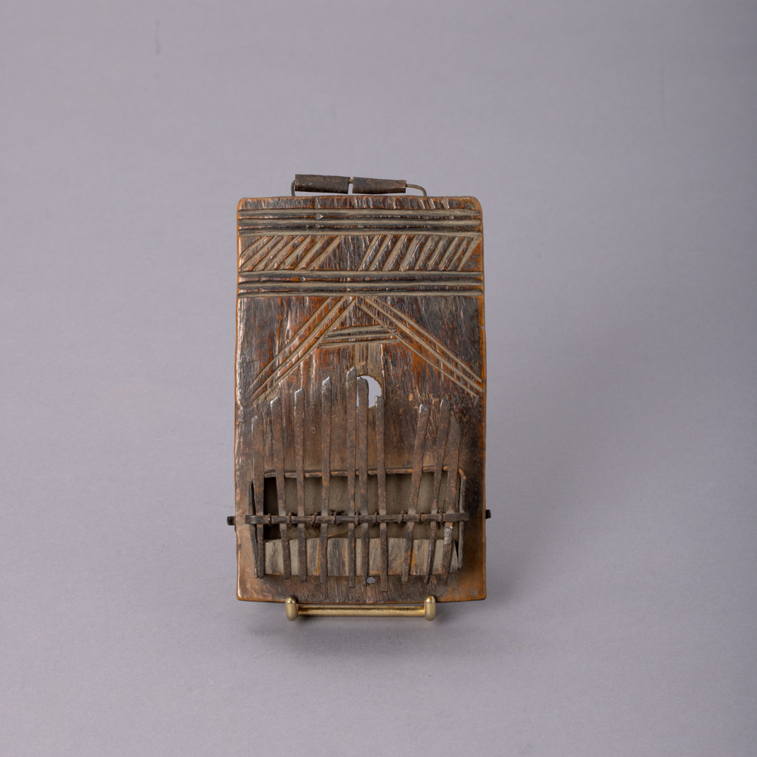 Instrumento musical africano, em madeira patinada com gravados geométricos e metal. Sinais de uso, pequenas falhas.