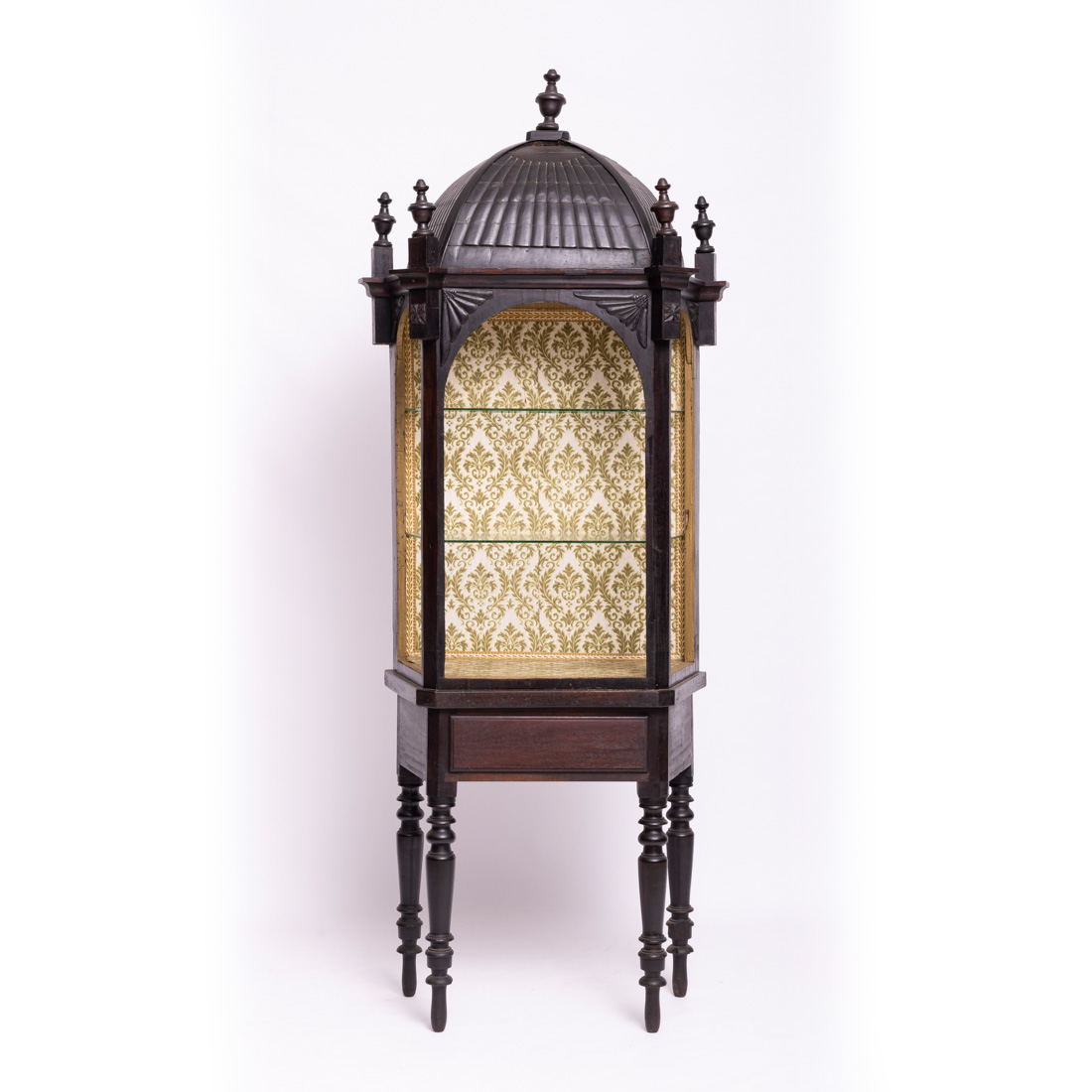 Em madeira com entalhamentos, de formato arquitectónico com cúpula e cimalha rematada por pináculos, com duas prateleiras em vidro. Falta vidros, pequenos defeitos e vestígios xilófagos.