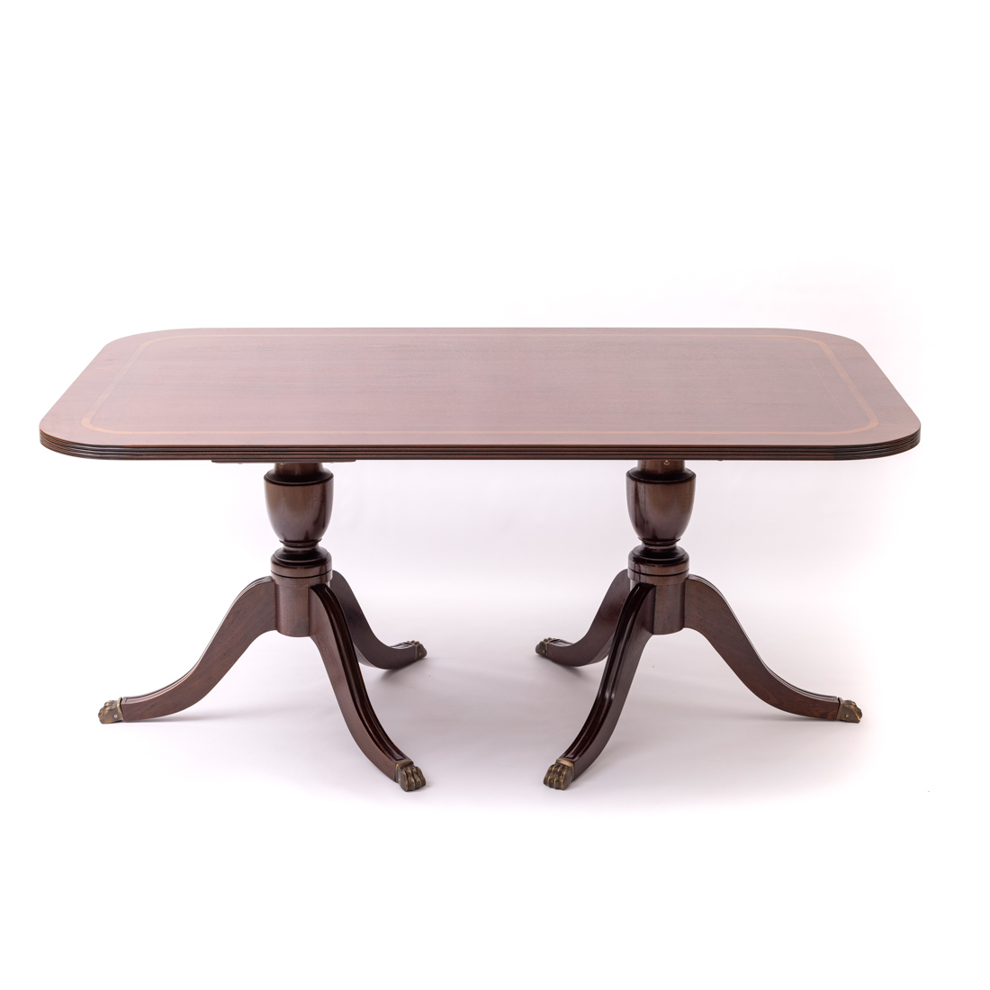 Em mogno com frisos embutidos em pau cetim e outras madeiras, tampo de formato rectangular, apoiado em duplo pé central. Sinais de uso.