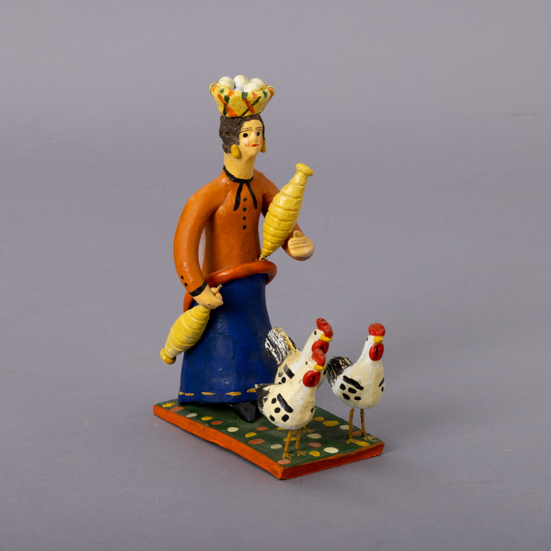 Escultura em barro, decoração policromada, marcada a carimbo Estremoz e assinada Maria Luisa. Sinais de uso e restauro.