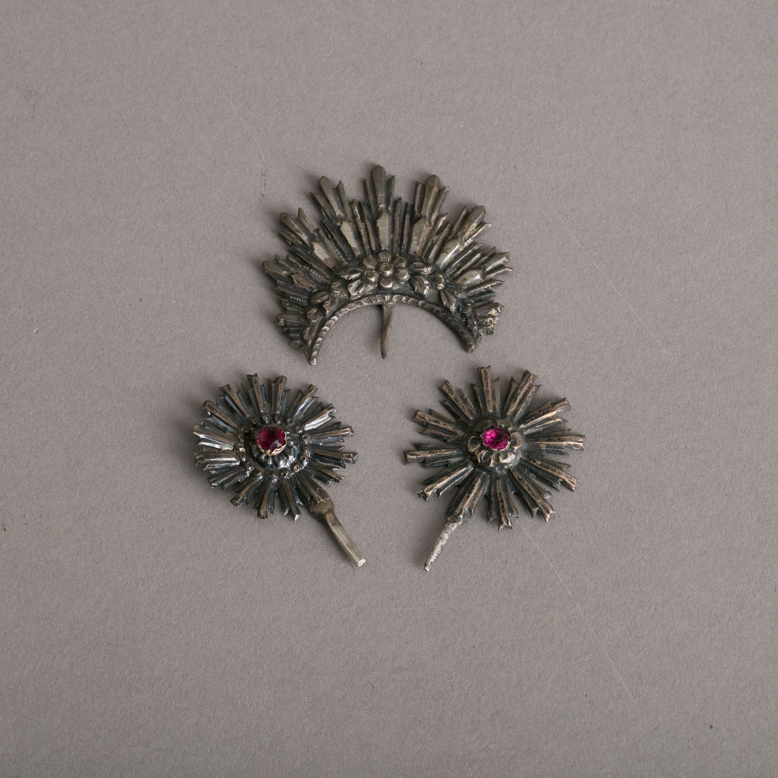 Em prata decoração relevada e recortada, dois cravejados com pedraria. Sem marcas, ao abrigo do Decreto-Lei n.º 120/2017. Sinais de uso, um com amolgadelas.