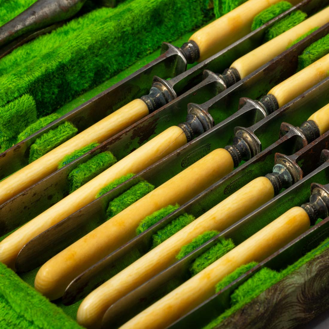 Cabos em massa simulando marfim, anilhas em prata sem marcas, ao abrigo do Decreto-Lei n.º 120/2017. Em estojo com defeitos. Francês. Pequenos defeitos e oxidações.