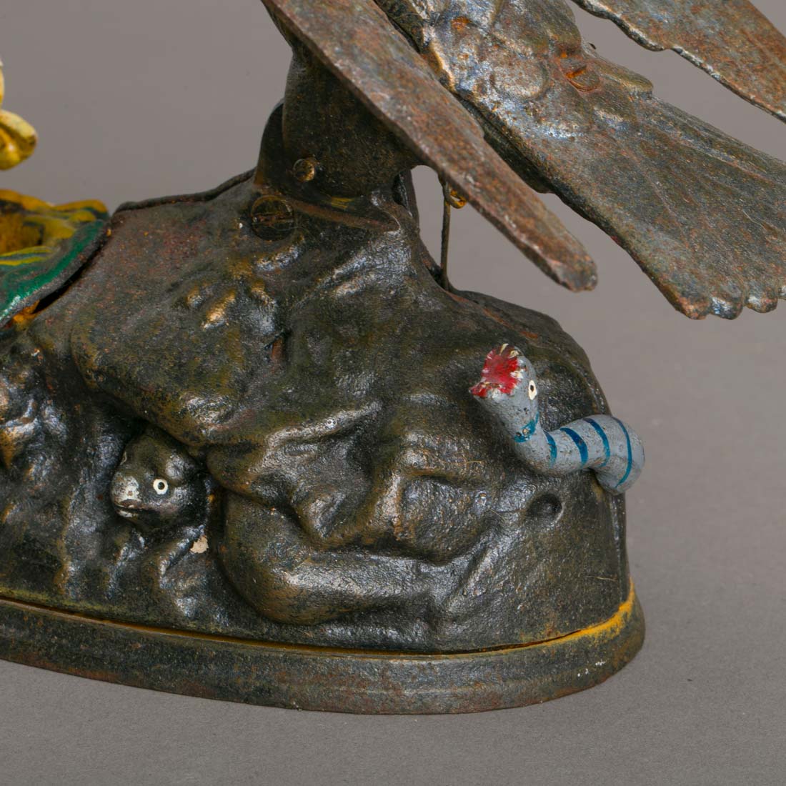 Em ferro fundido, decoração policromada representando pássaro alimentando seus filhotes, com animação mecânica. Marcado. Sinais de uso, algum desgaste.