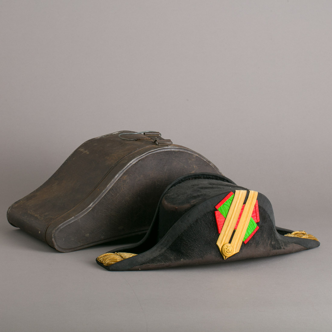 Em tecido e outros materiais, com galões dourados. Fabrico A. Da Costa, Lda., Lisboa. Com caixa em metal. Sinais de uso, desgaste e pequenos defeitos.