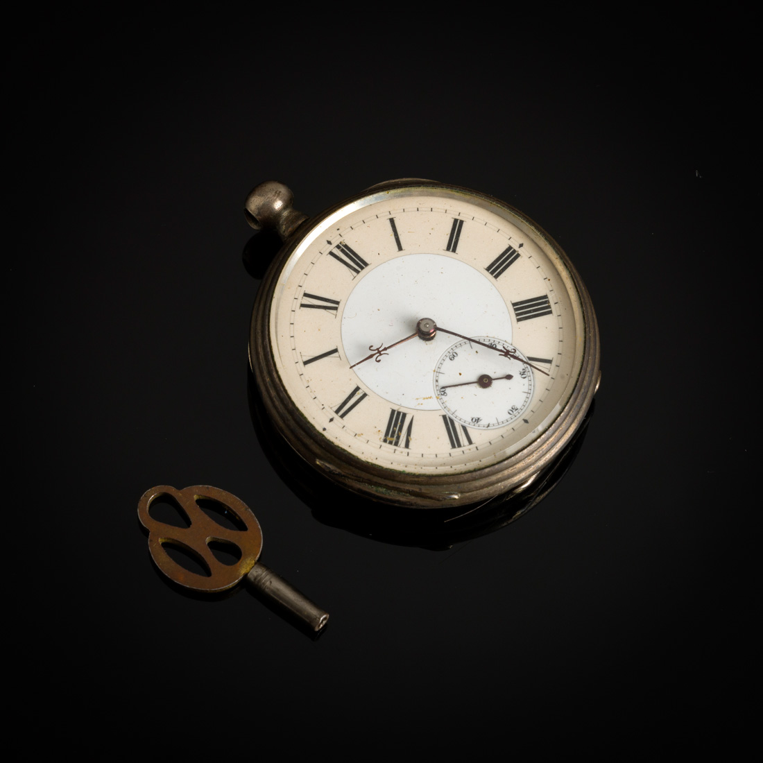 Caixa em prata decorada com gravados, mostrador em esmalte com numeração romana. Movimento mecânico de chave. Com chave. Em marcha. Sem marcas, ao abrigo do Decreto-Lei n.º 120/2017. Sinais de uso e falta de argola.