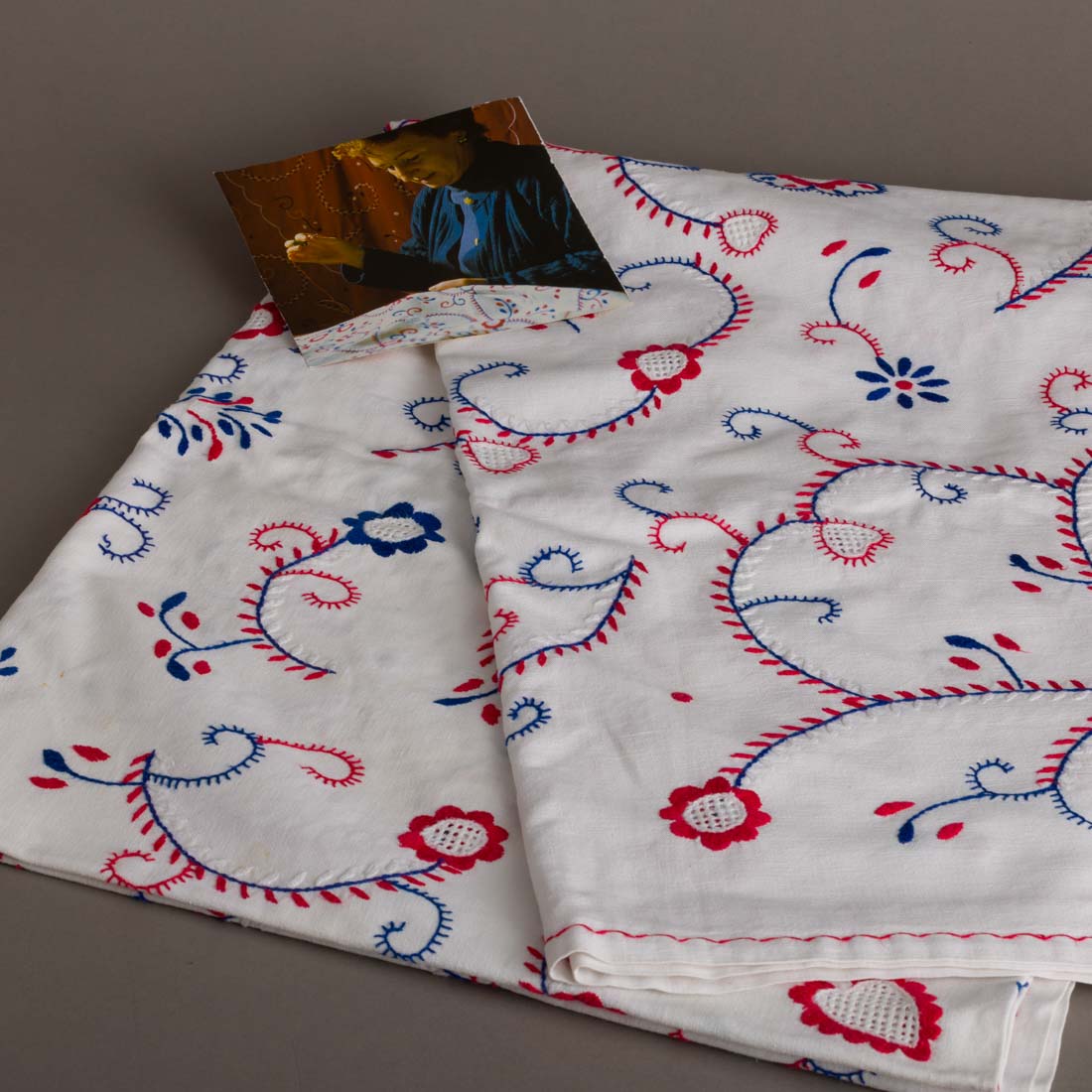 Em linho bordado a vermelho e a azul por Isilda Parente (uma das mais reputadas artesãs da região, a sua obra está espalhada pelos 4 cantos do mundo e alguns dos seus bordados foram utilizados em criações do estilista Nuno Gama).